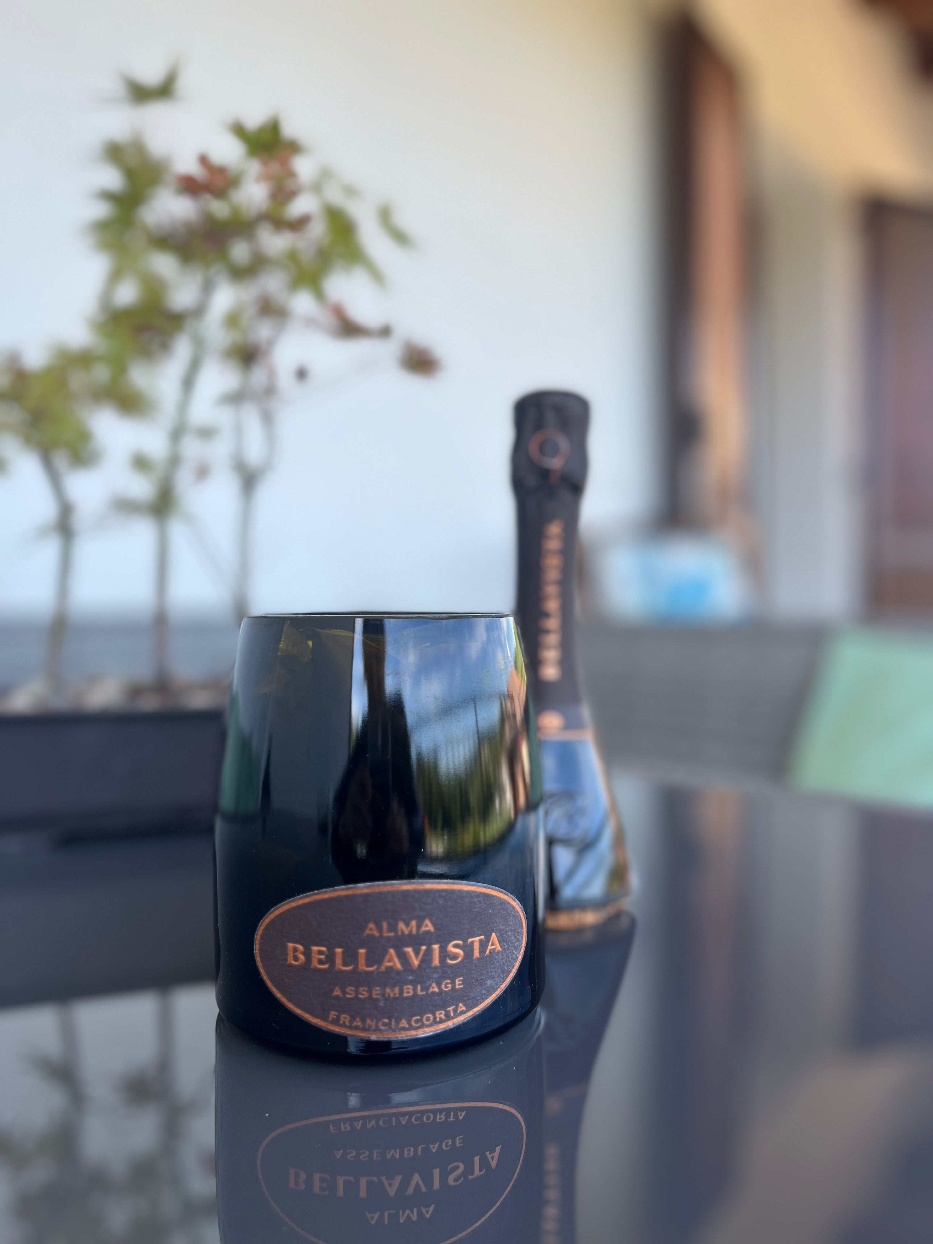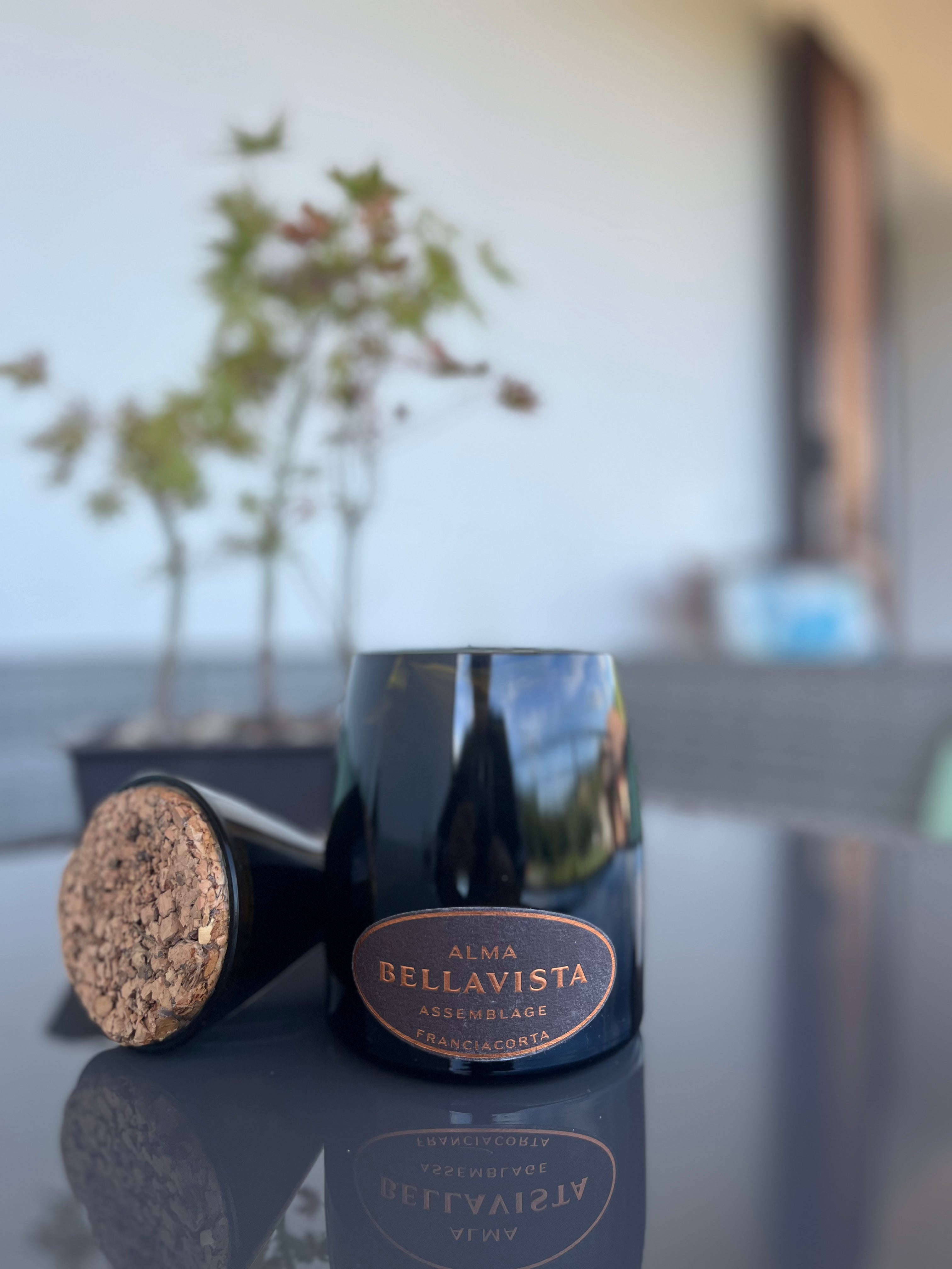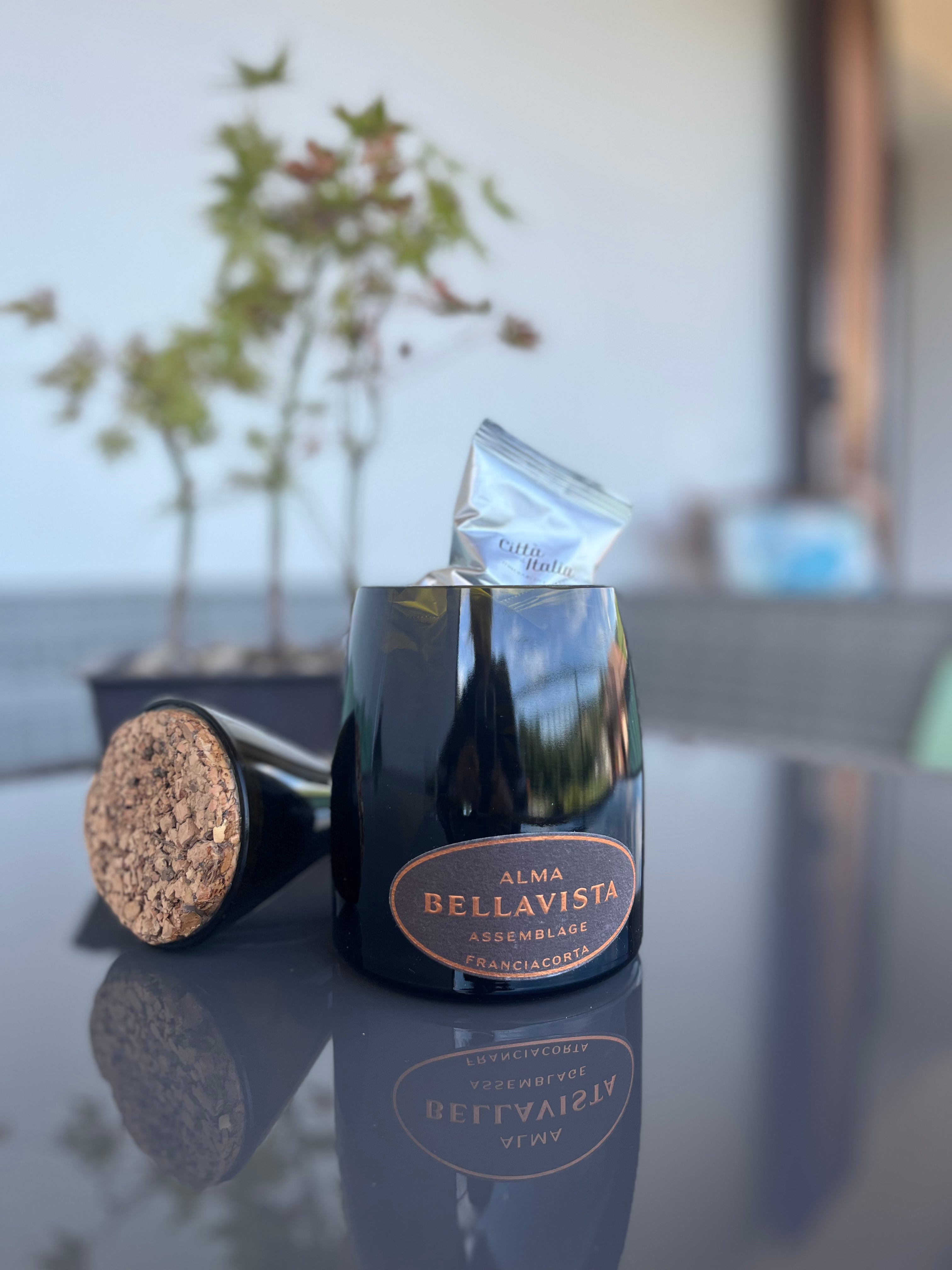 La bottiglia di Bellavista Assemblage, (ancora con capsula perché da esposizione) è tagliata e molata, il sughero si incastra nella bottiglia per creare un oggetto di design e allo stesso tempo utilità per la casa. Nelle foto usato come porta cialde, ma ottimo anche come porta caramelle o biscotti.