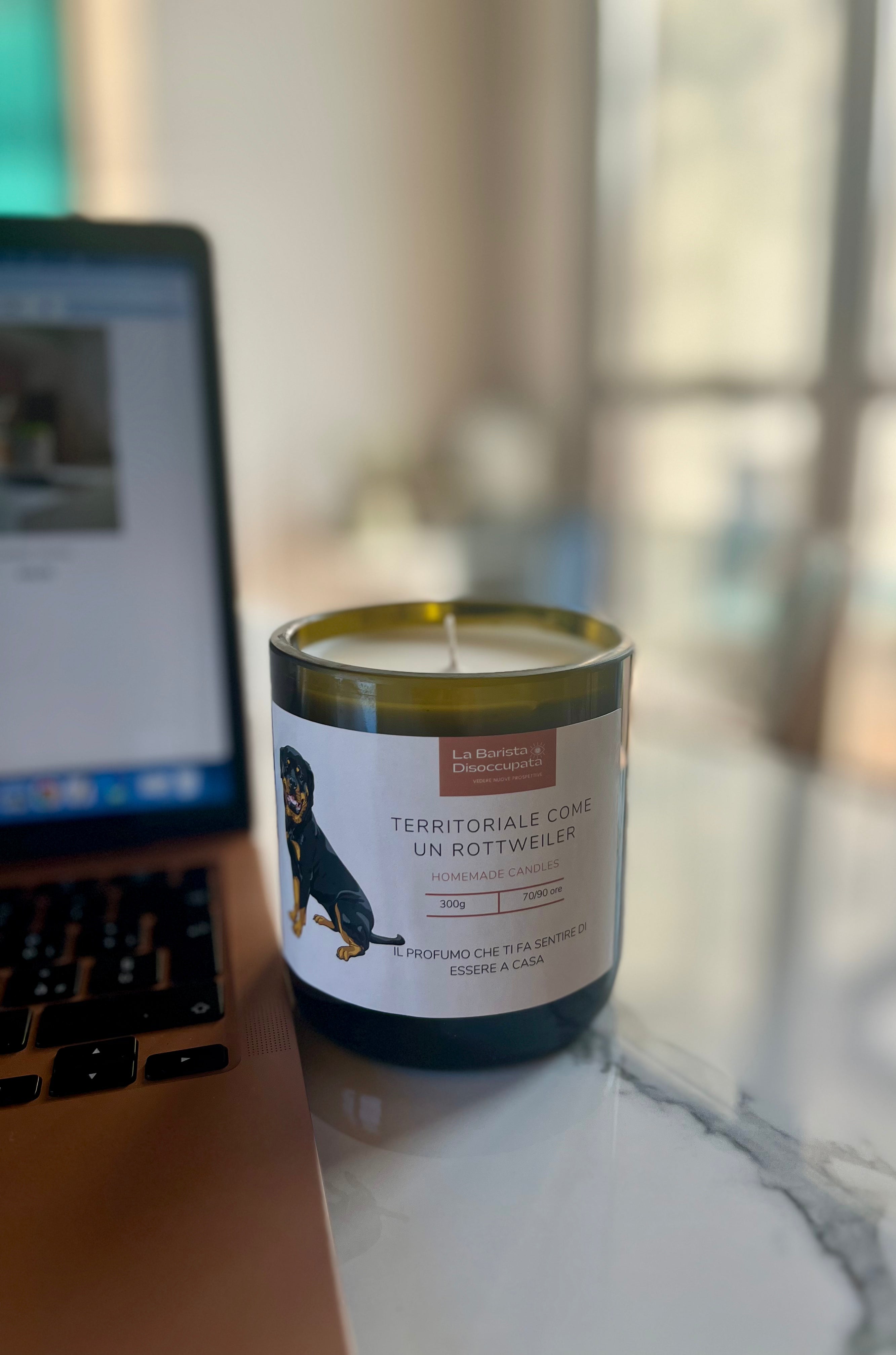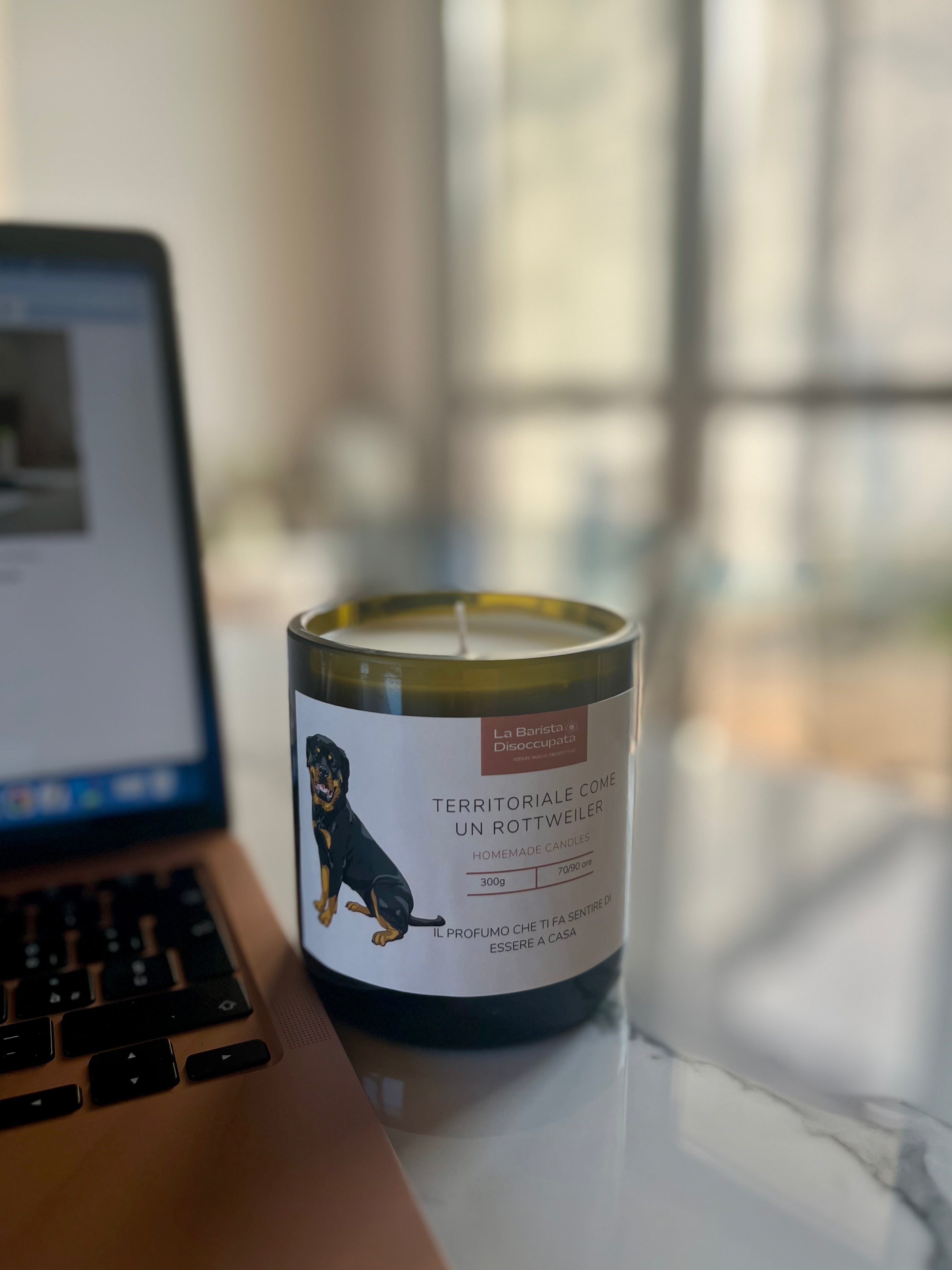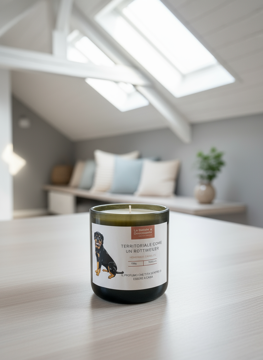 Realizzata all'interno di bottiglie di vino verdi tagliate e molate, impreziosite da etichette dedicate ai nostri amici a 4 zampe, create in cera di soia, stoppino in cotone e dai profumi legati alle caratteristiche delle razze che vengono rappresentate. Sono tutte pensate con la scatolina color havana per accompagnarle.