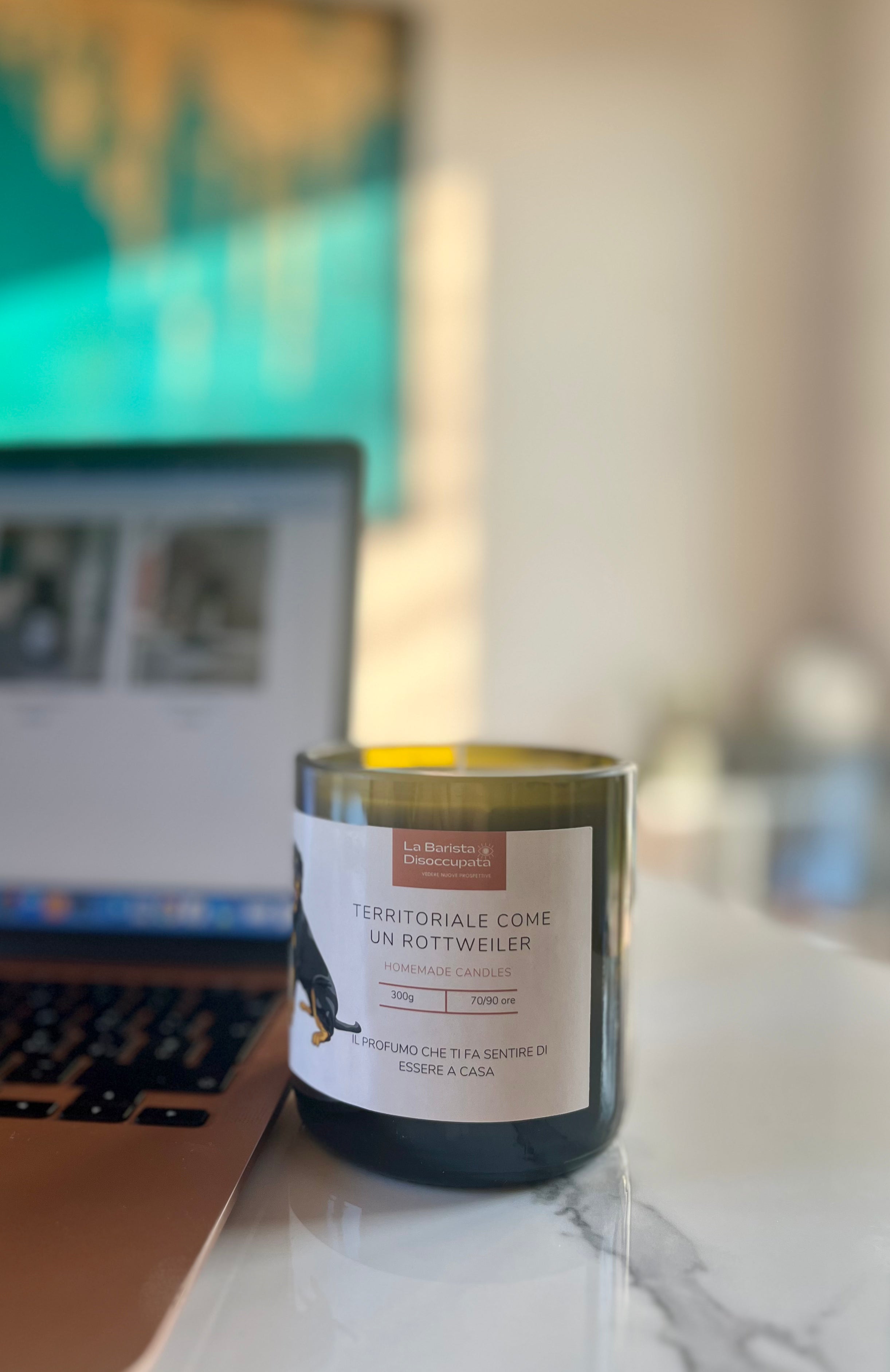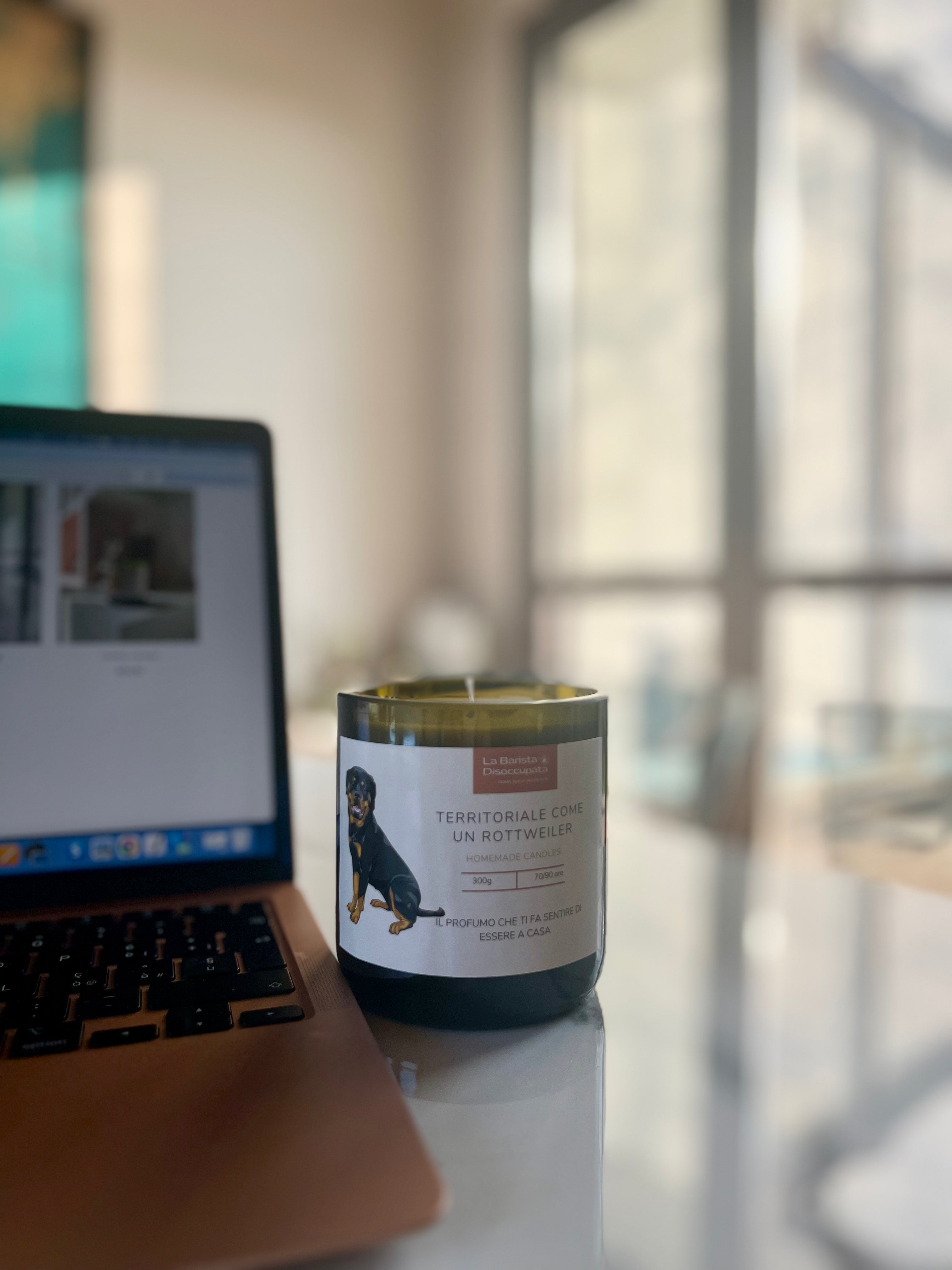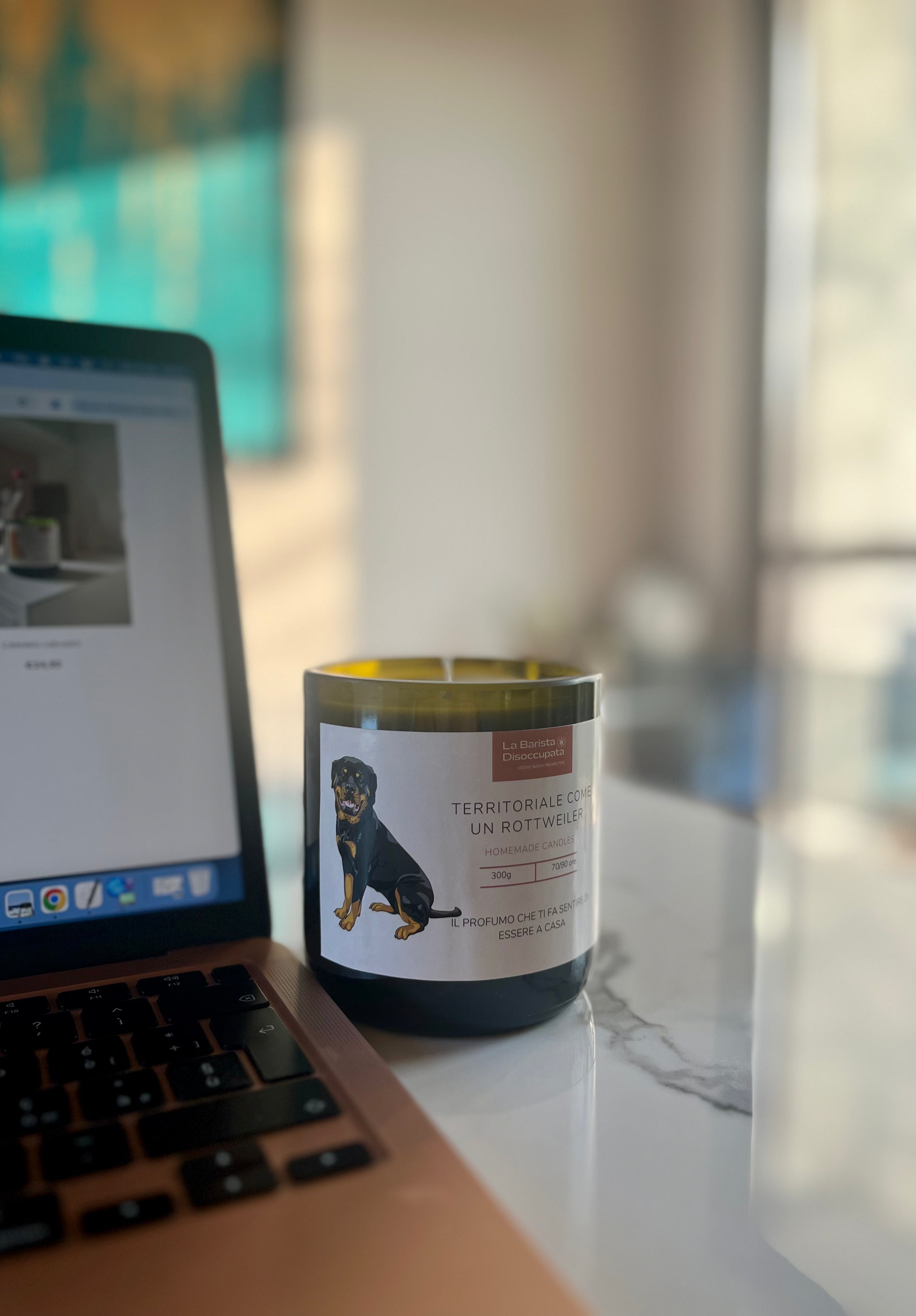 Realizzata all'interno di bottiglie di vino verdi tagliate e molate, impreziosite da etichette dedicate ai nostri amici a 4 zampe, create in cera di soia, stoppino in cotone e dai profumi legati alle caratteristiche delle razze che vengono rappresentate. Sono tutte pensate con la scatolina color havana per accompagnarle.