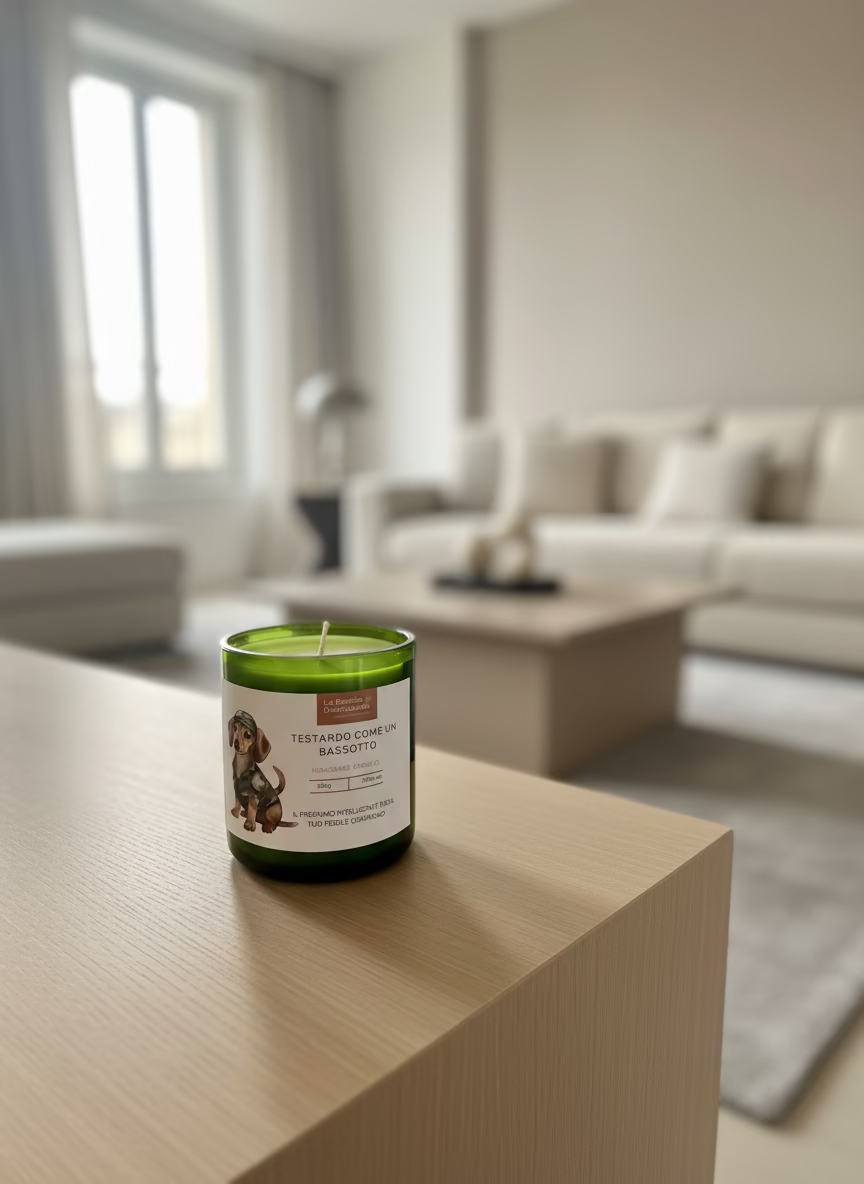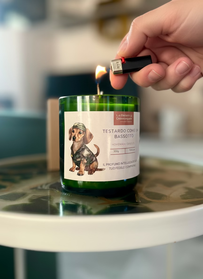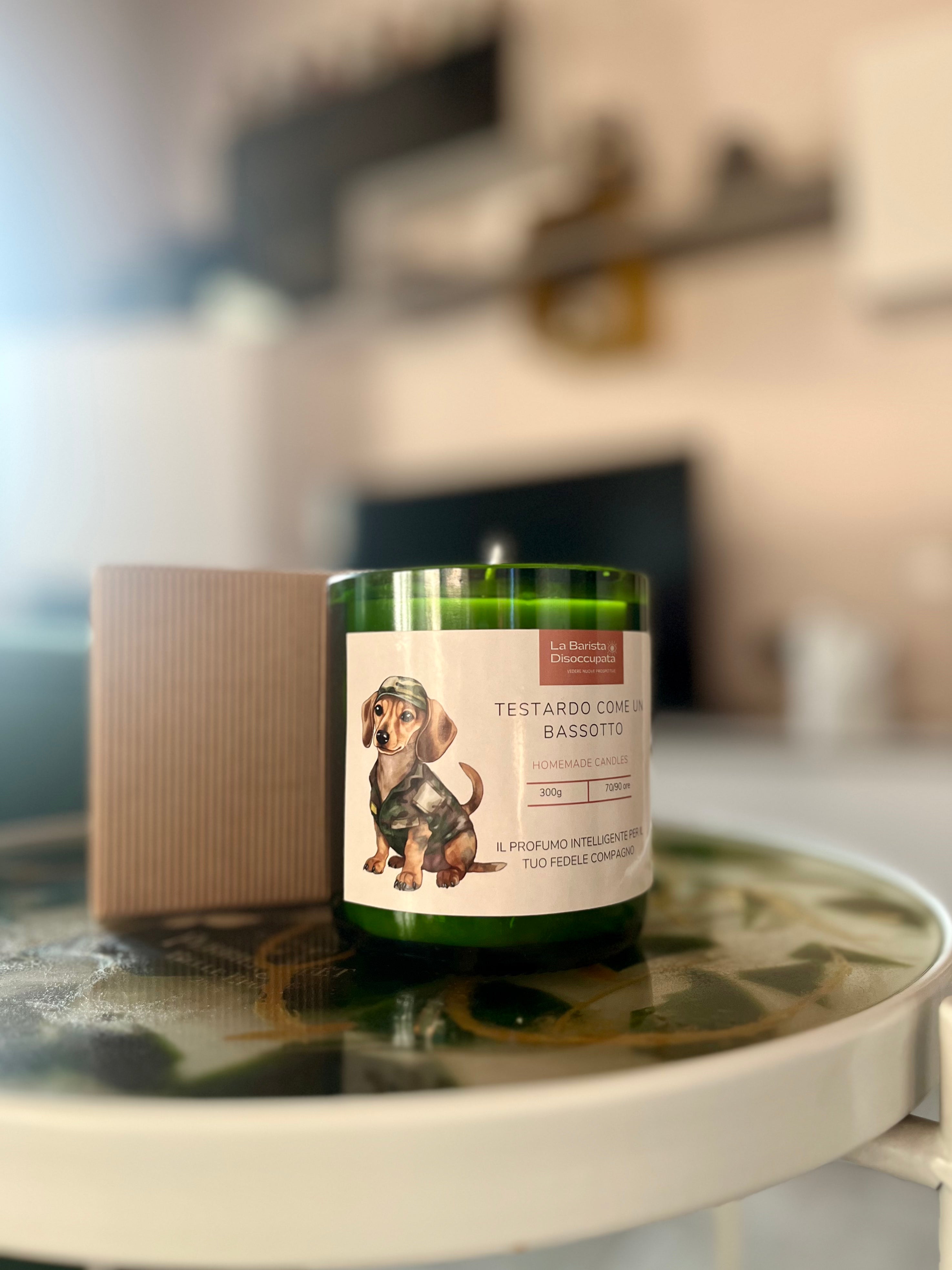 Realizzata all'interno di bottiglie di vino verdi tagliate e molate, impreziosite da etichette dedicate ai nostri amici a 4 zampe, create in cera di soia, stoppino in cotone e dai profumi legati alle caratteristiche delle razze che vengono rappresentate. Sono tutte pensate con la scatolina color havana per accompagnarle.