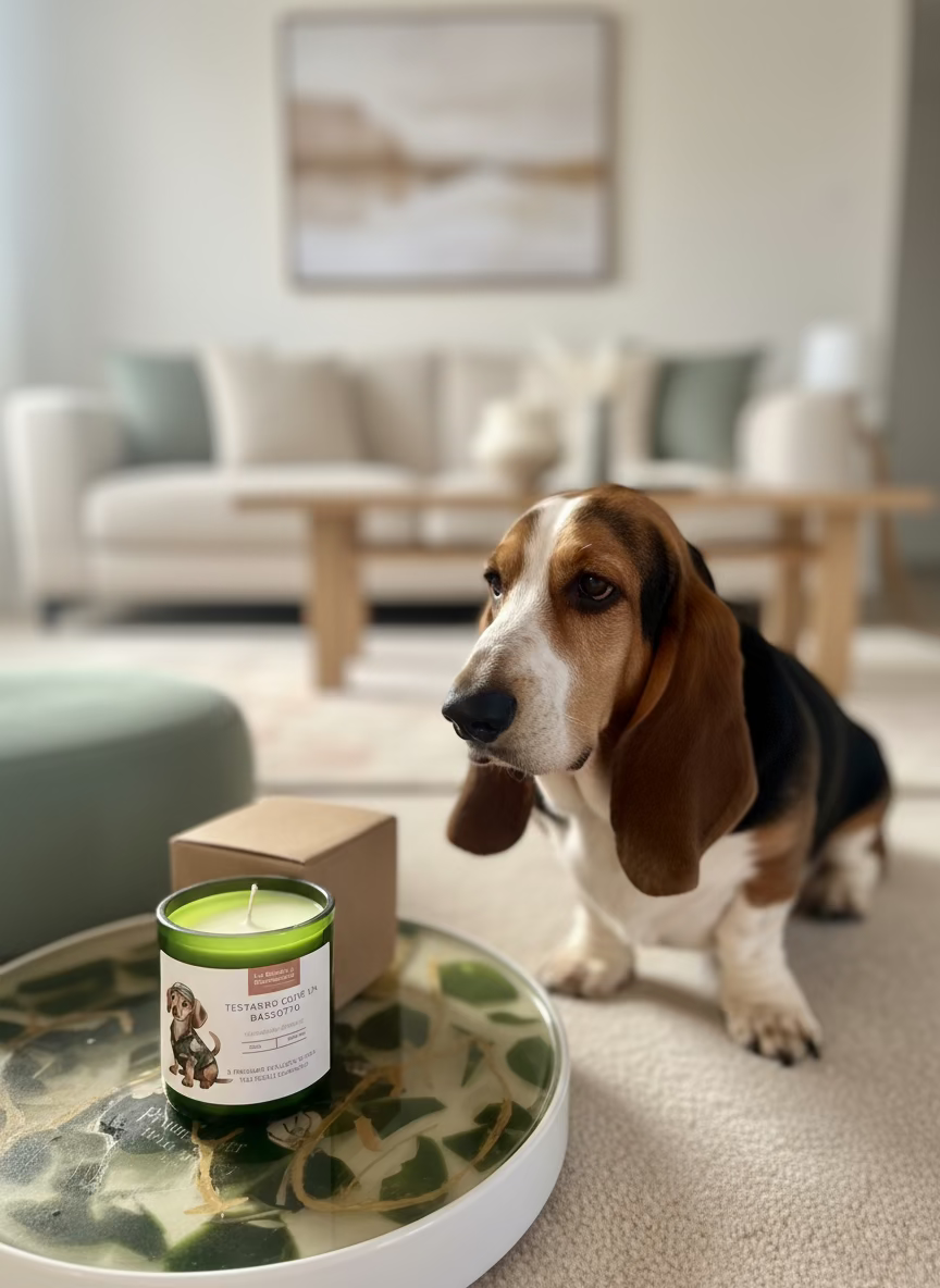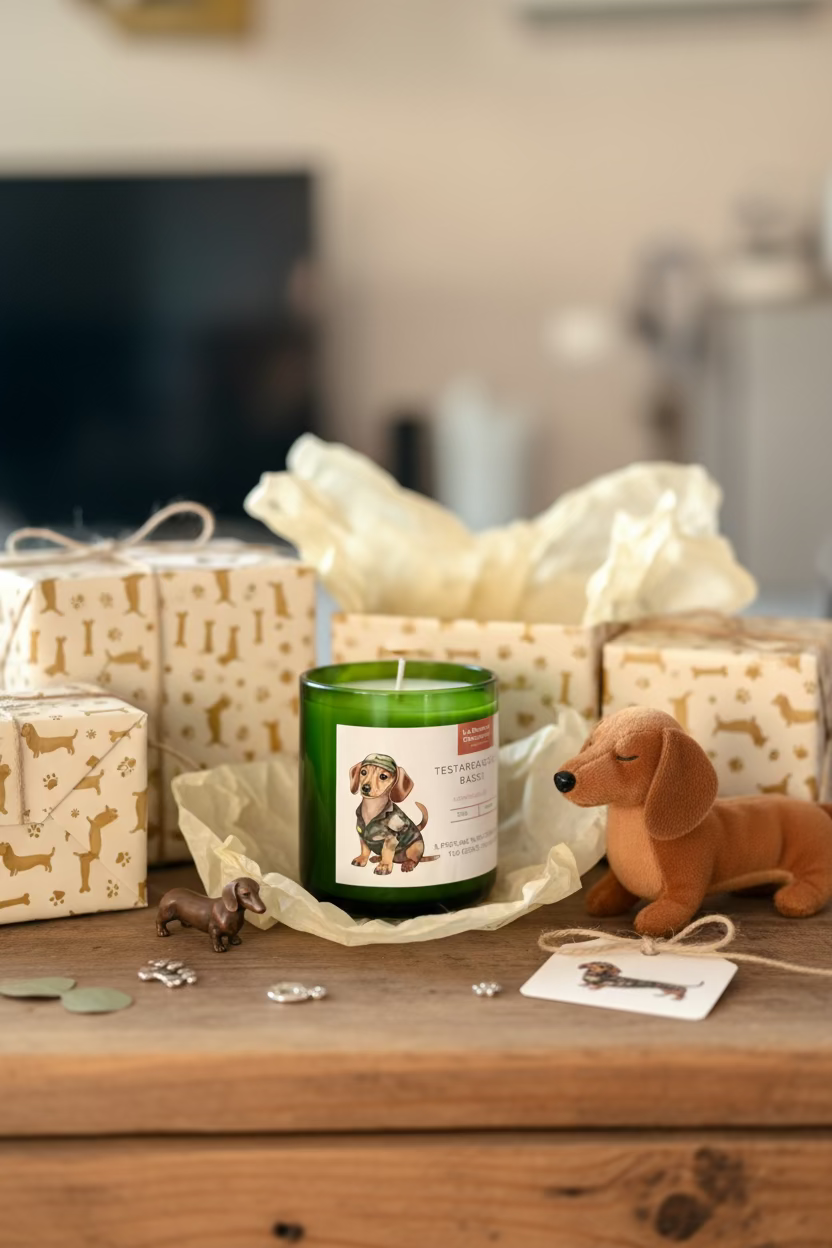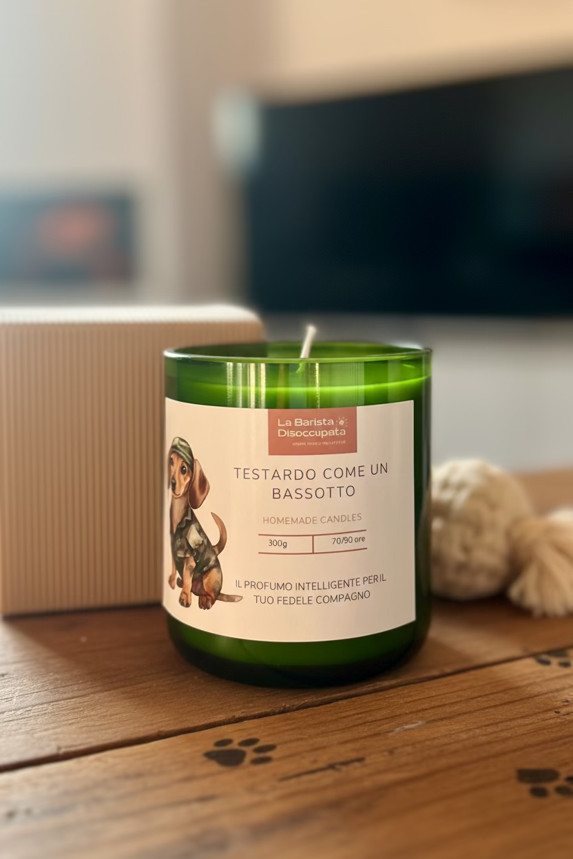 Realizzata all'interno di bottiglie di vino verdi tagliate e molate, impreziosite da etichette dedicate ai nostri amici a 4 zampe, create in cera di soia, stoppino in cotone e dai profumi legati alle caratteristiche delle razze che vengono rappresentate. Sono tutte pensate con la scatolina color havana per accompagnarle.