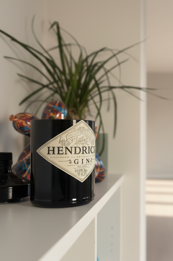 Candela artigianale di design ricavata dalla iconica bottiglia di Gin Hendrick's. Il vetro scuro riciclato con etichetta vittoriana diventa un elegante oggetto d'arredo profumato dal fascino british, perfetto come idea regalo luxury per gli amanti dei gin premium.
