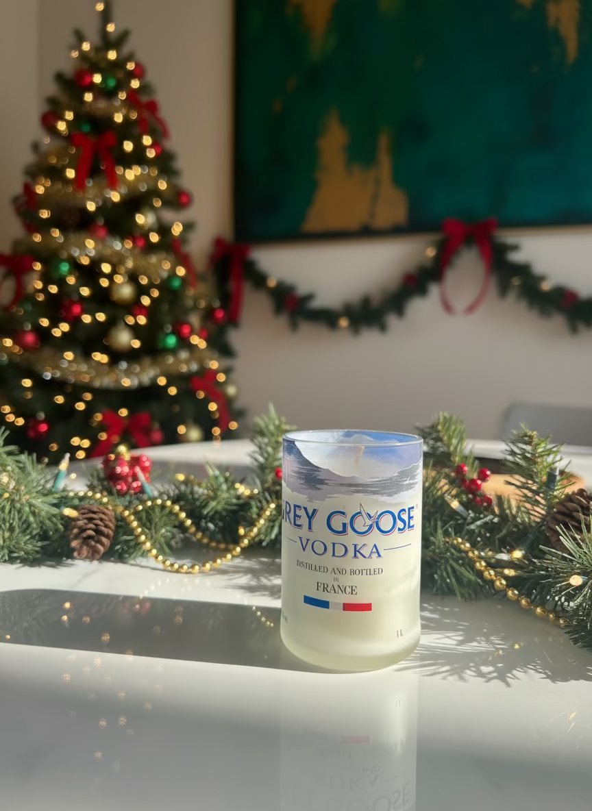 Il contenitore è ottenuto dal riciclo di bottiglie in vetro usate tagliate e molate per essere sicure al tatto. La colatura della cera naturale composta da soia, viene fatta manualmente e dopo un lungo procedimento volto a chiudere ogni buco e alla decorazione, viene messa a disposizione sullo shop. Il taglio e la levigatura del vetro vengono curati in maniera professionale per renderla "morbida" al tatto ed evitare tagli per chi la tocca.