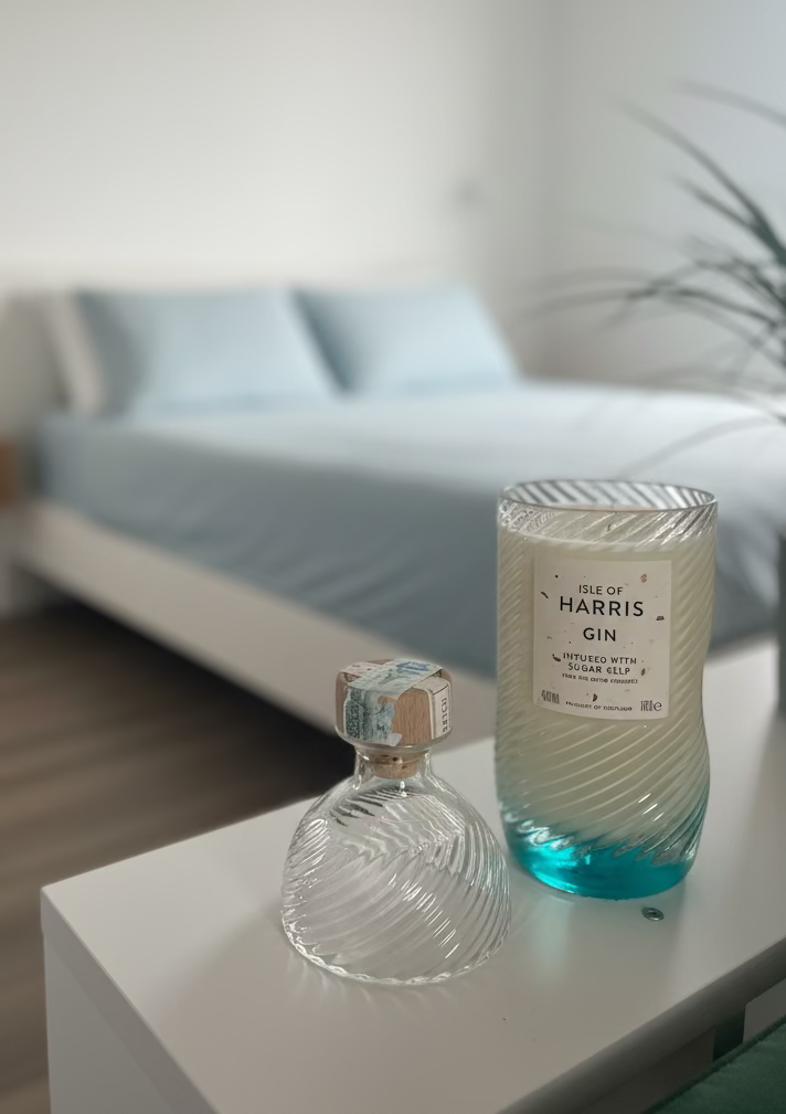 La colatura della cera naturale composta da soia, viene fatta manualmente e dopo un lungo procedimento volto a chiudere ogni buco e alla decorazione, viene messa a disposizione sullo shop. Il taglio e la levigatura del vetro vengono curati in maniera maniacale per renderla "morbida" al tatto ed evitare tagli per chi la tocca. Le piccole imperfezioni donano alla stessa l'unicità che merita ognuno di questi pezzi.