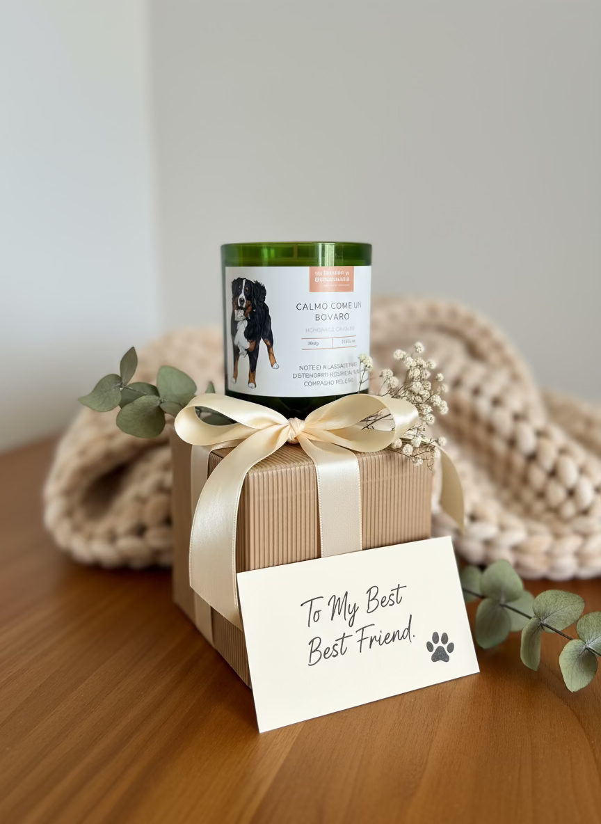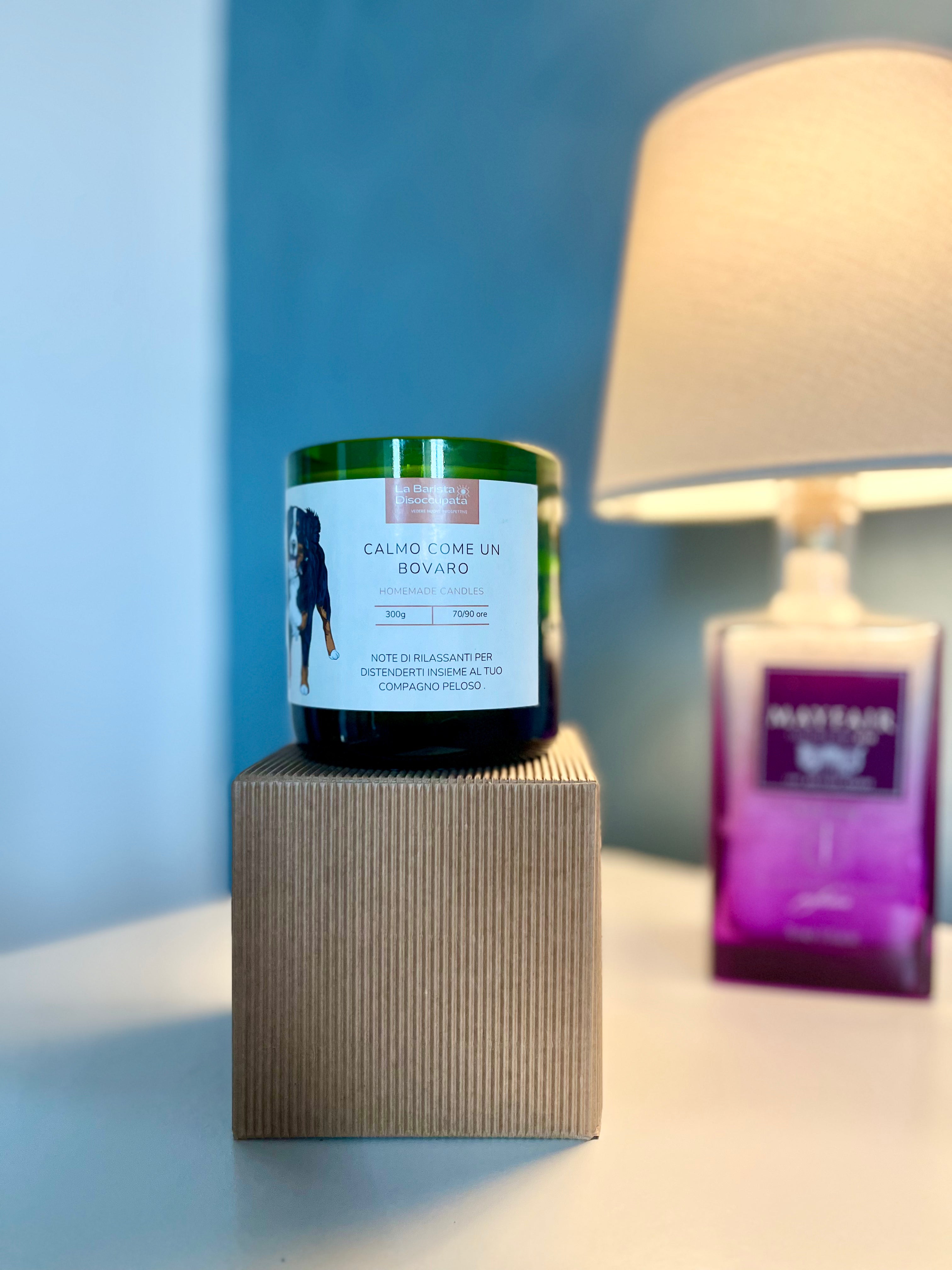 Realizzata all'interno di bottiglie di vino verdi tagliate e molate, impreziosite da etichette dedicate ai nostri amici a 4 zampe, create in cera di soia, stoppino in cotone e dai profumi legati alle caratteristiche delle razze che vengono rappresentate. Sono tutte pensate con la scatolina color havana per accompagnarle. Dati tecnici: Peso della cera 250g circa, levigatura su corpo della bottiglia.