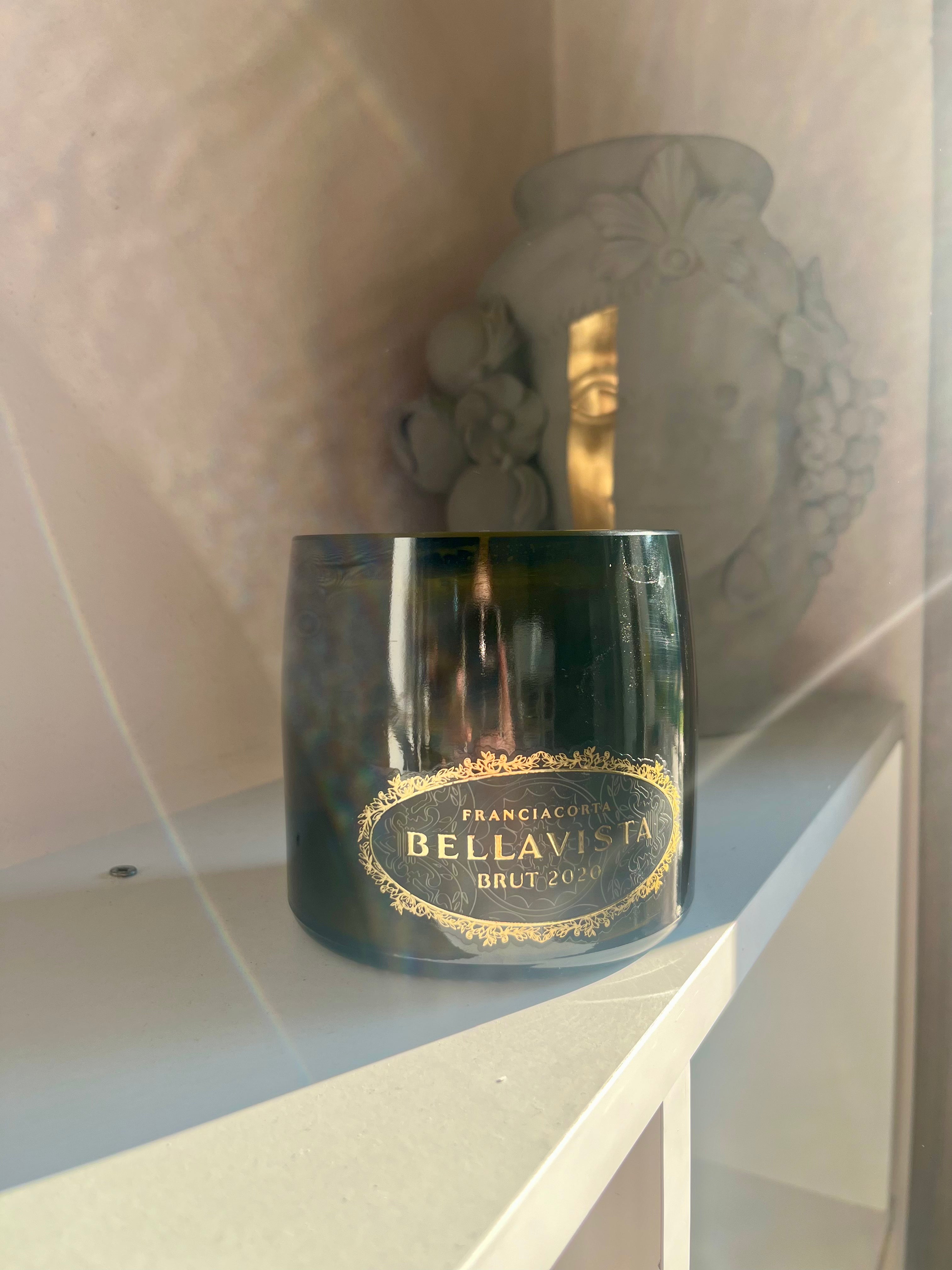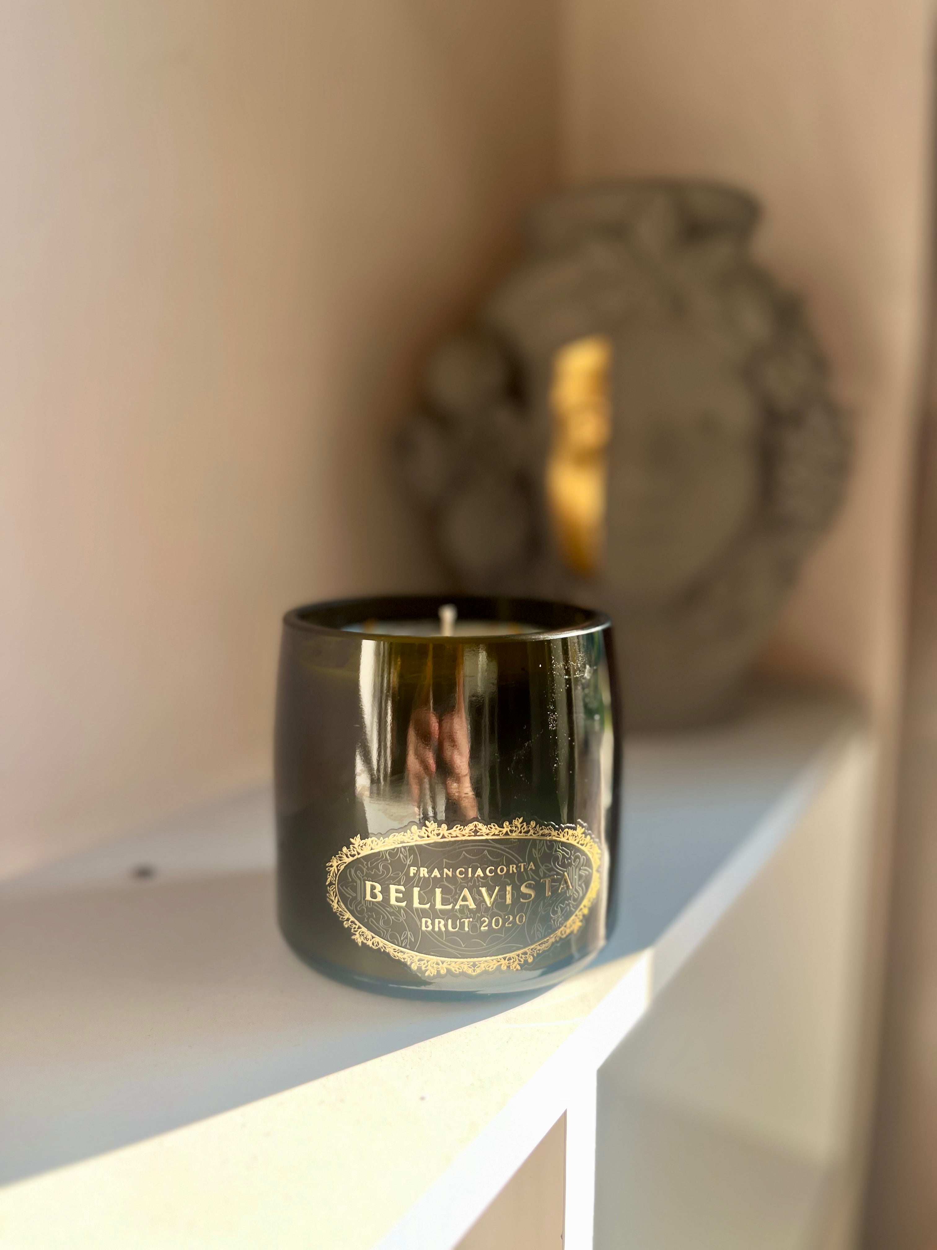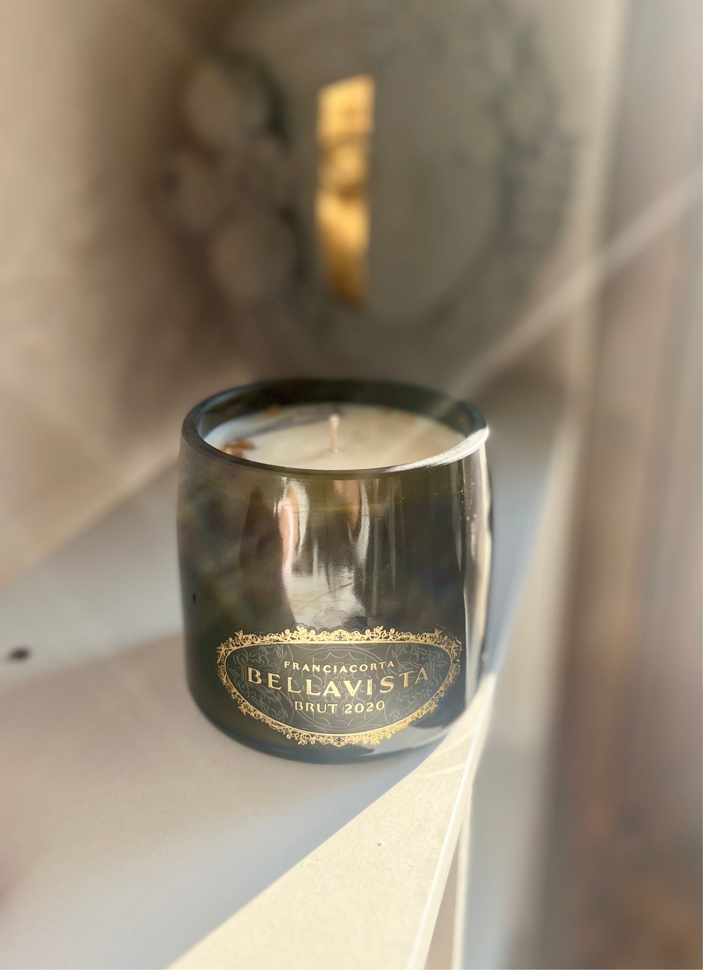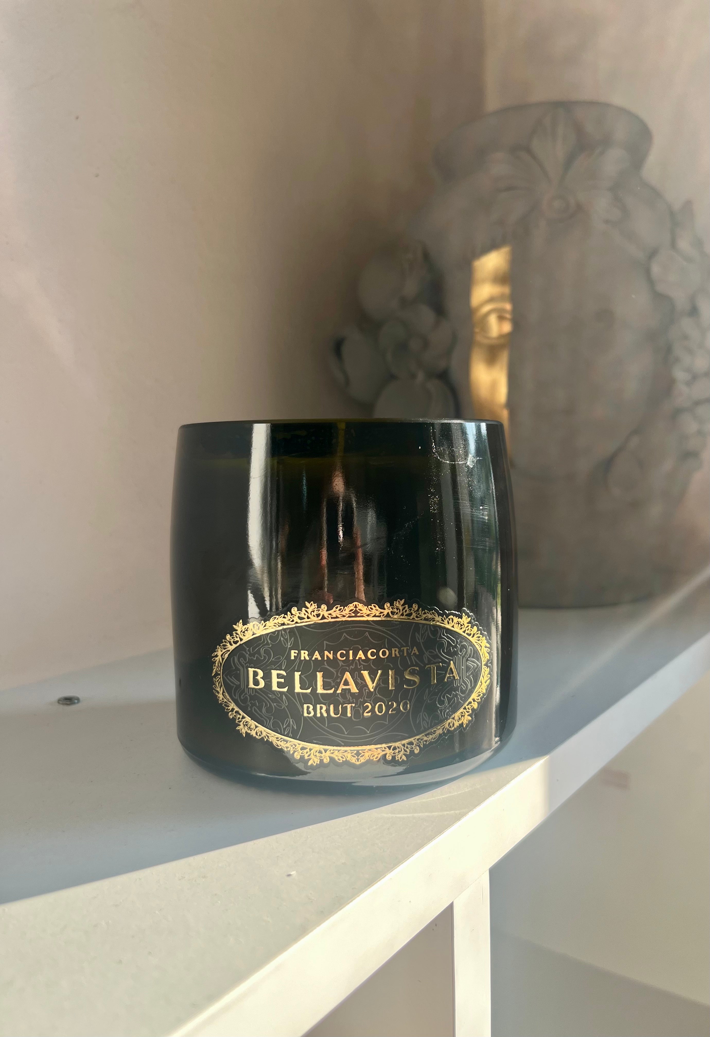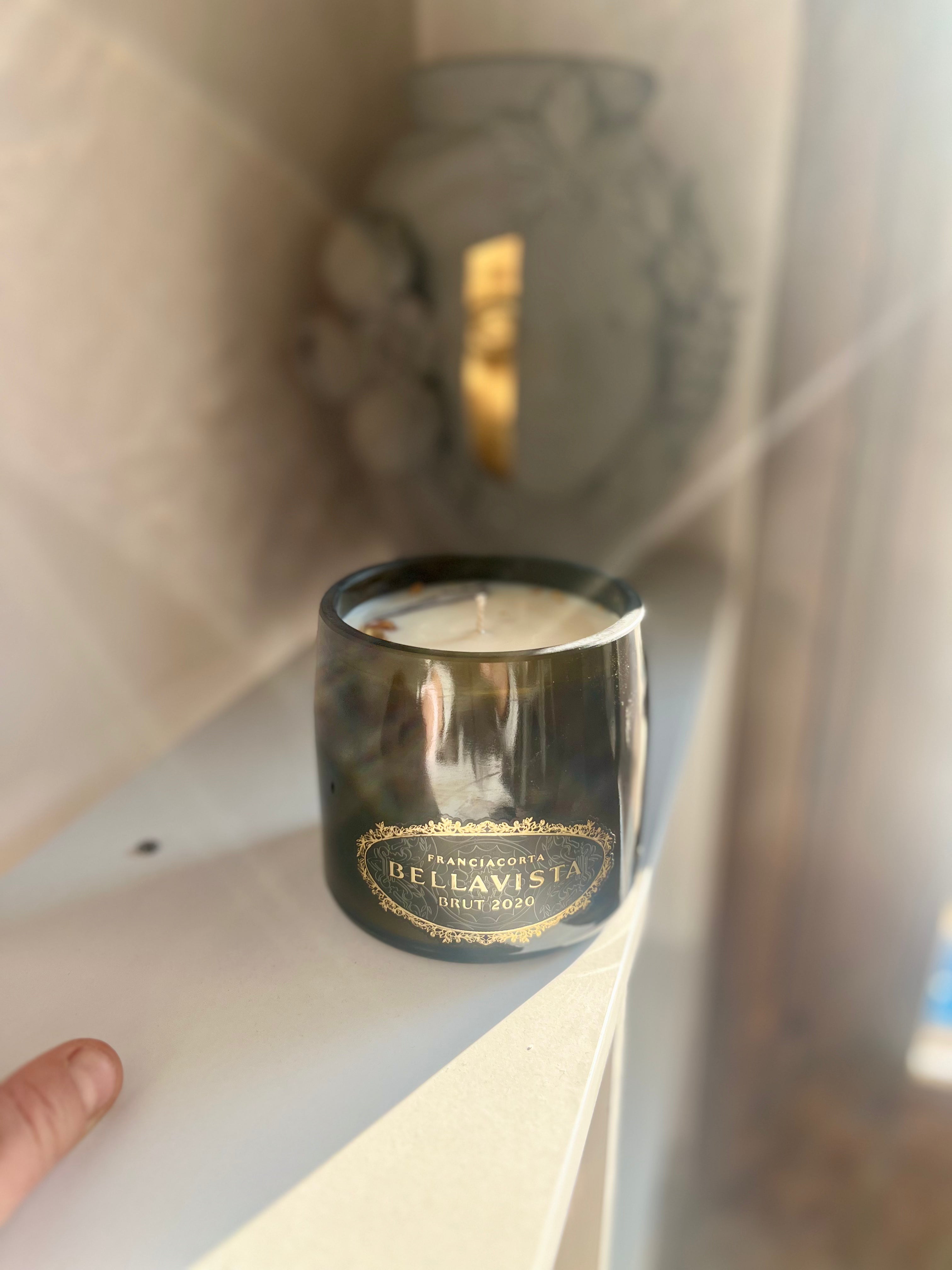 Bottiglia cicciottella e dal vetro molto spesso e robusto. La colatura della cera naturale composta da soia, viene fatta manualmente e dopo un lungo procedimento volto a chiudere ogni buco e alla decorazione, viene messa a disposizione sullo shop. Il taglio e la levigatura del vetro vengono curati in maniera maniacale per renderla "morbida" al tatto ed evitare tagli per chi la tocca. Le piccole imperfezioni donano alla stessa l'unicità che merita ognuno di questi pezzi.