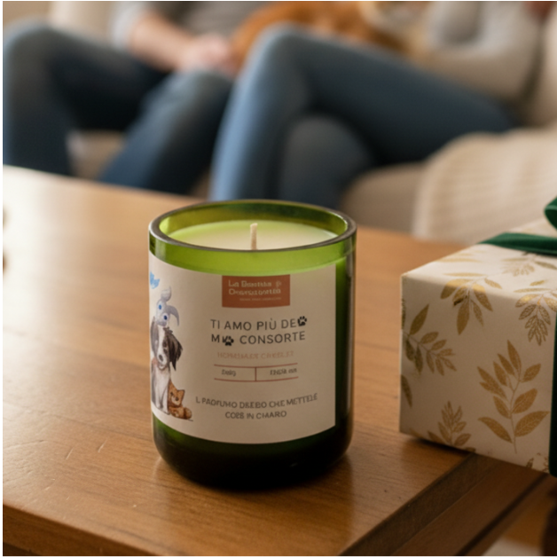 Una candela artigianale ironica e divertente dedicata a chi ama il proprio cane più di chiunque altro. Realizzata in bottiglia di vino verde riciclata, con un'etichetta che dice la verità che tutti i dog lovers pensano ma non osano dire!