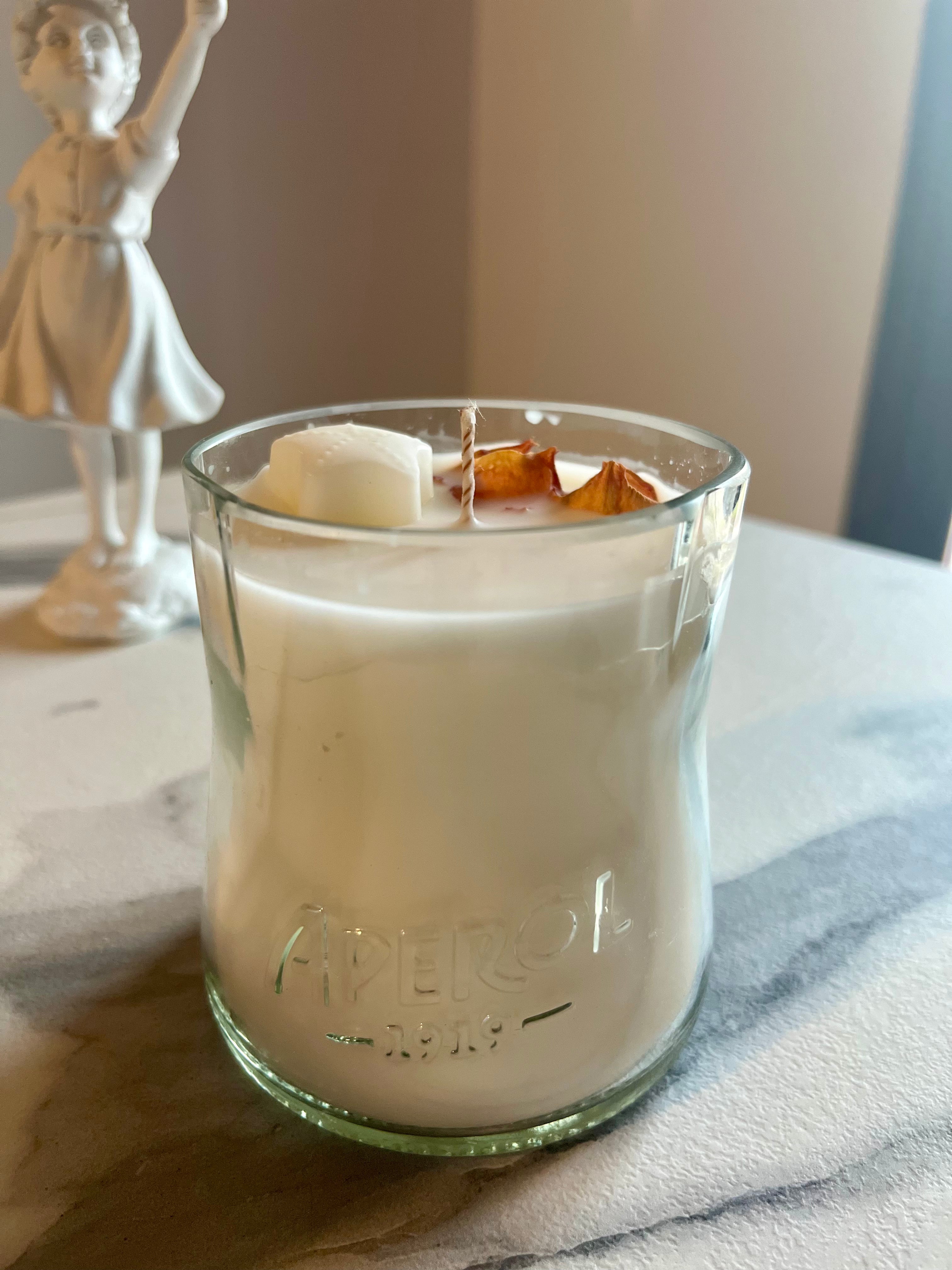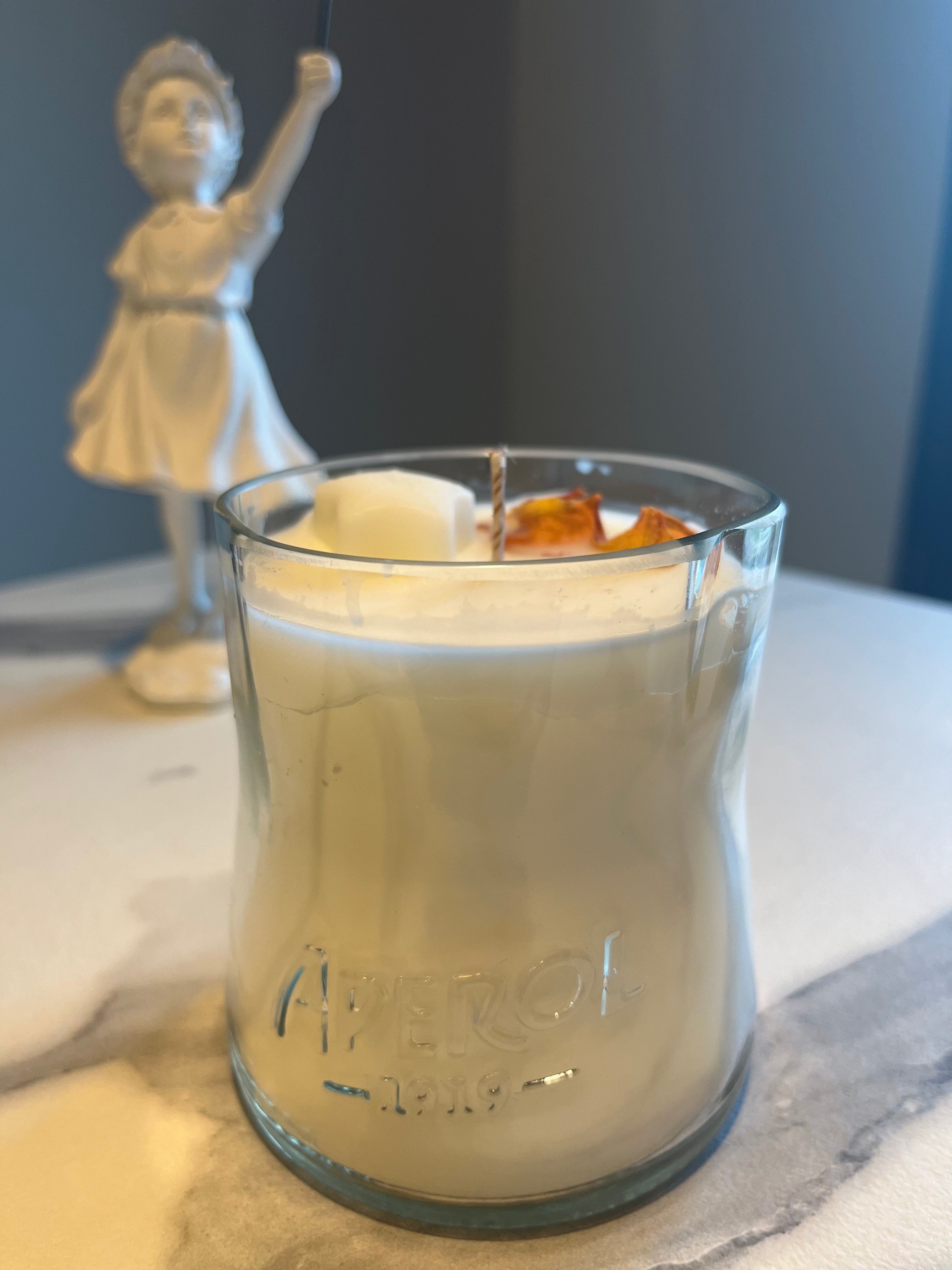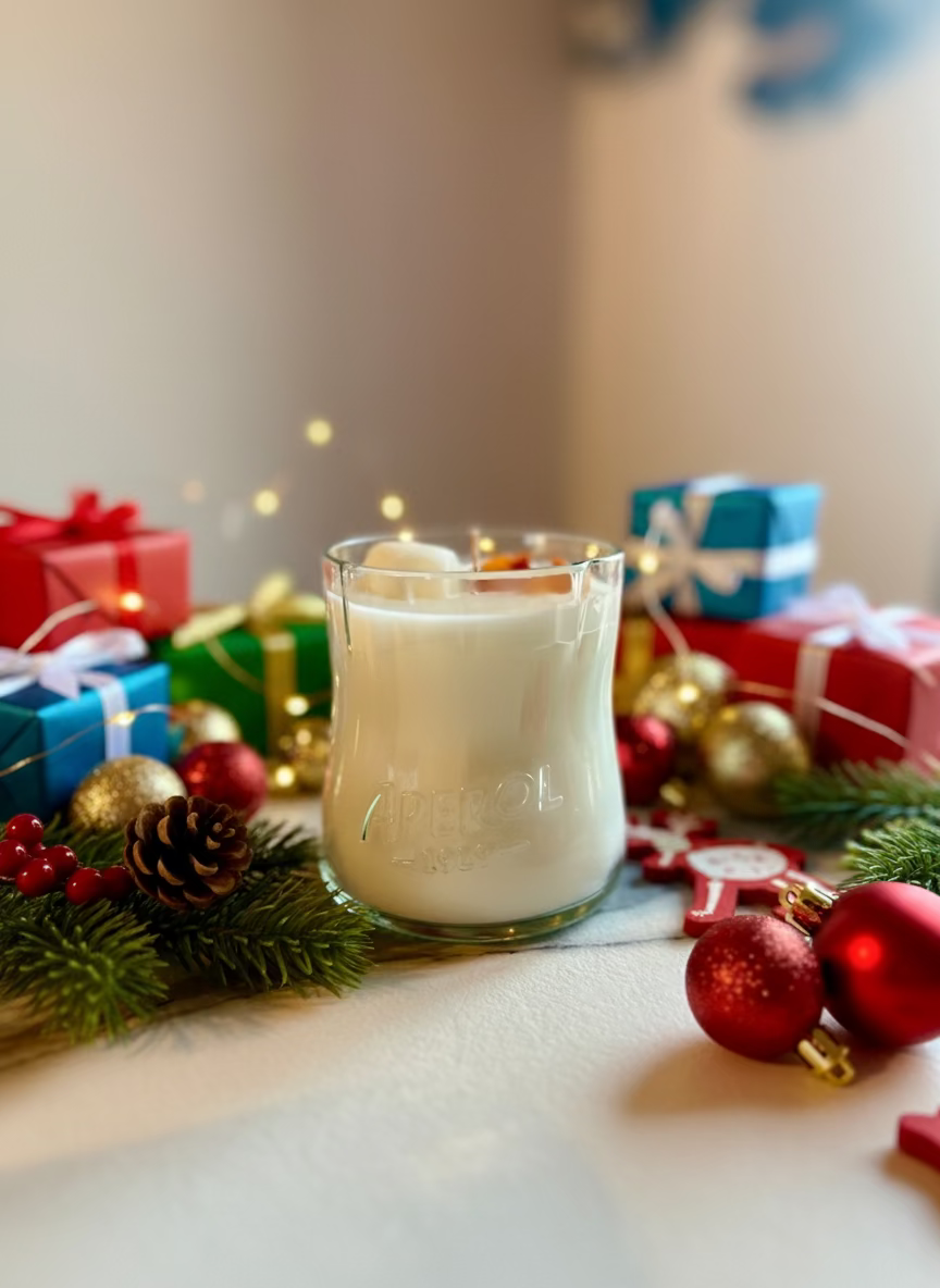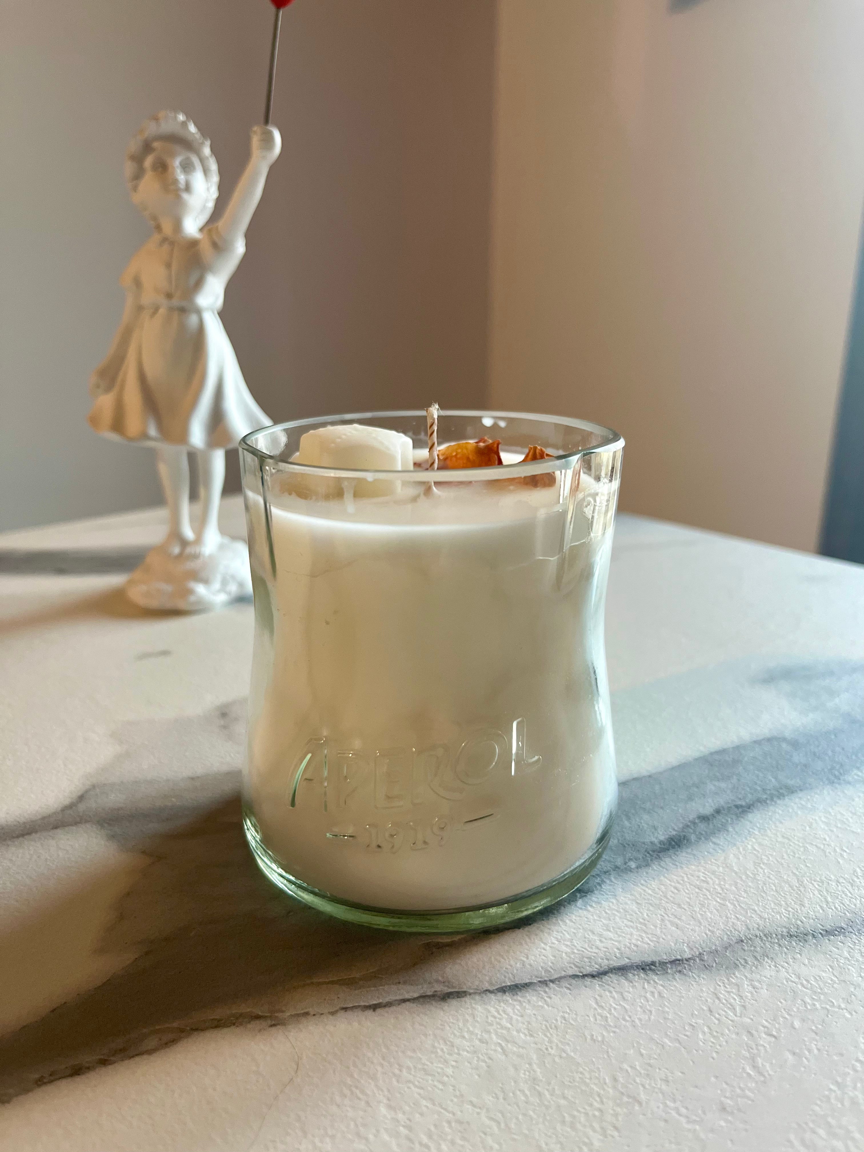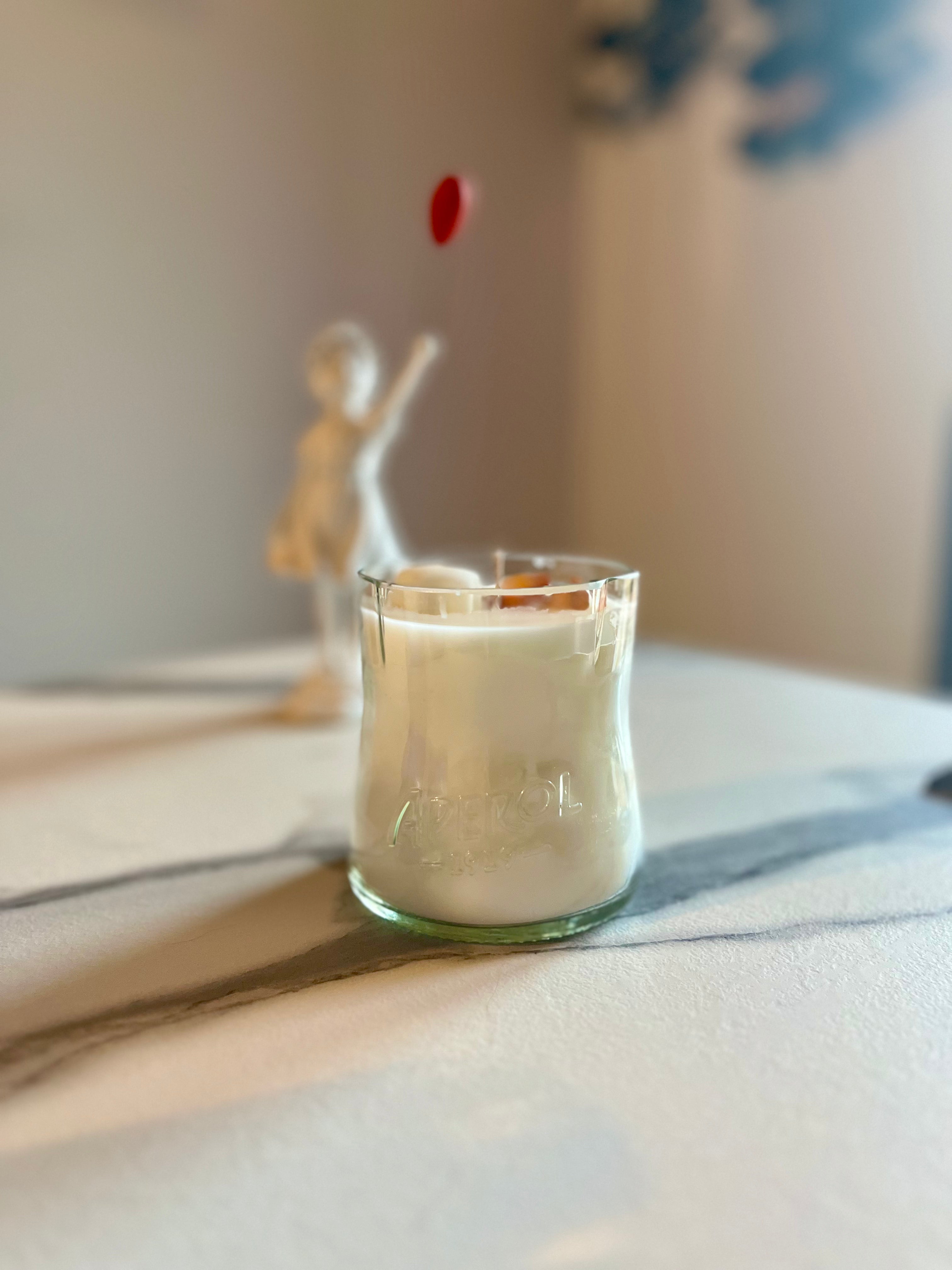 Il contenitore è ottenuto dal riciclo di bottiglie in vetro usate tagliate e molate per essere sicure al tatto. La colatura della cera naturale composta da soia, viene fatta manualmente e dopo un lungo procedimento volto a chiudere ogni buco e alla decorazione, viene messa a disposizione sullo shop. Il taglio e la levigatura del vetro vengono curati in maniera professionale per renderla "morbida" al tatto ed evitare tagli per chi la tocca.