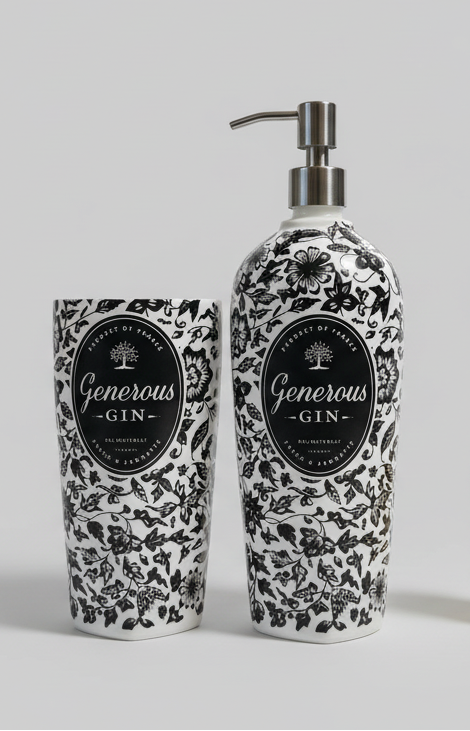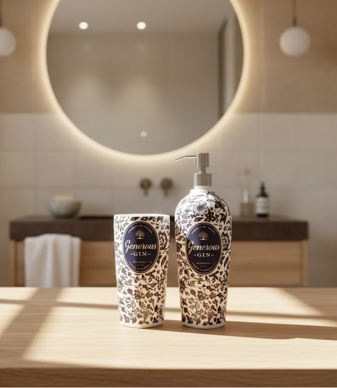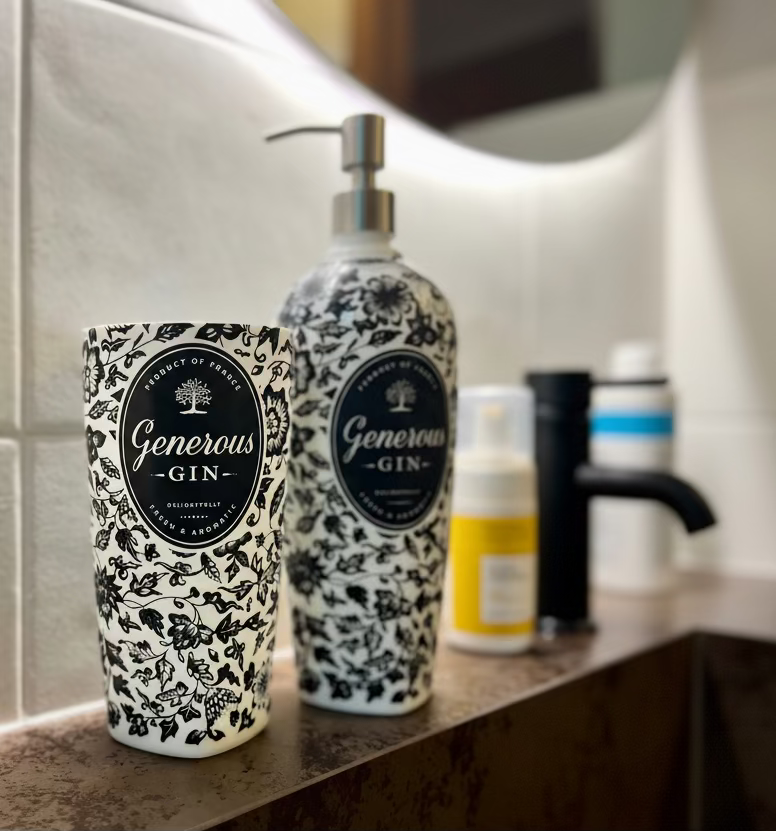 Completa il tuo bagno con questo raffinato set bagno artigianale composto da dispenser sapone e portaspazzolini, realizzati da un'autentica bottiglia di Generous Gin da 700ml.