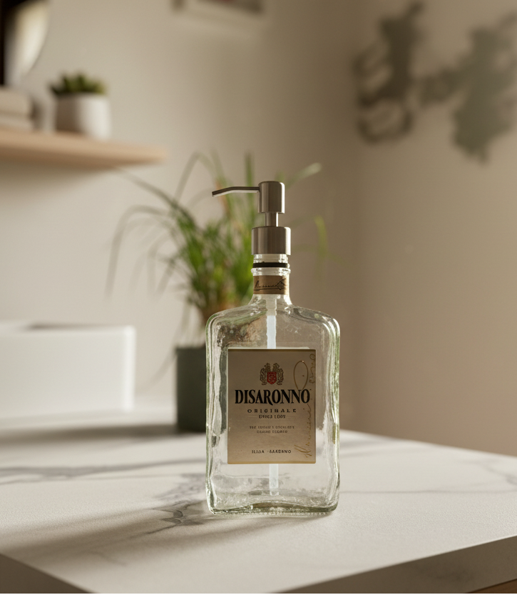 Dispenser per sapone ricavato da una bottiglia di amaretto Disaronno che si adatta perfettamente alla stessa, formato da 700 ml.