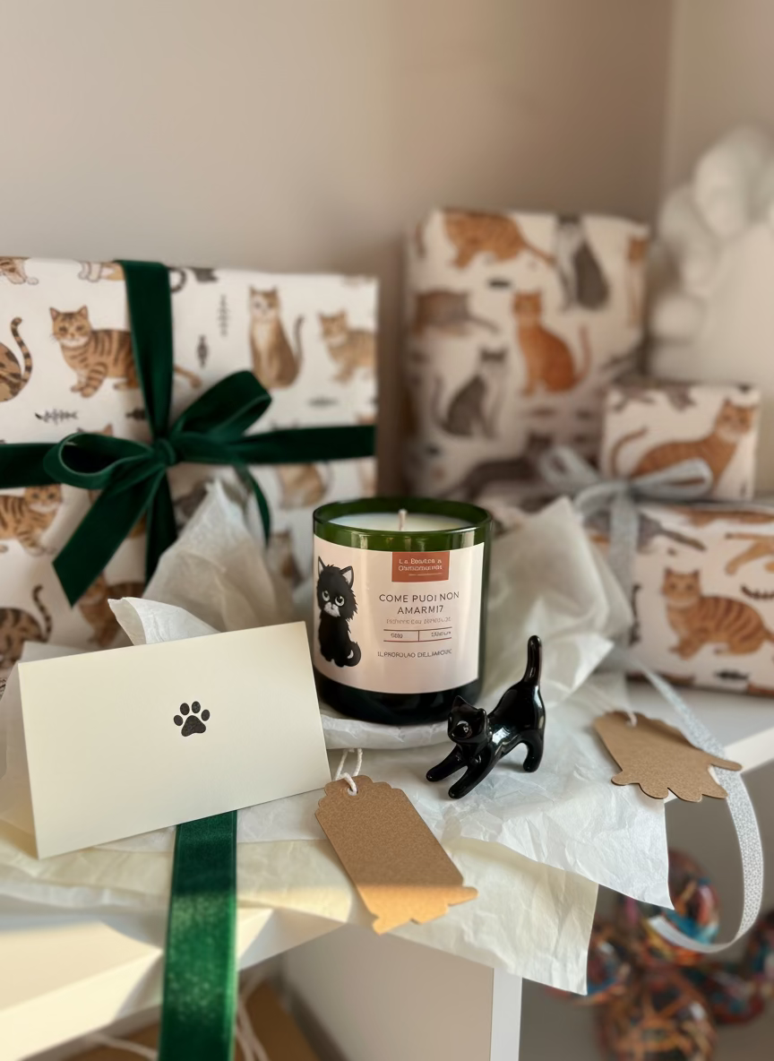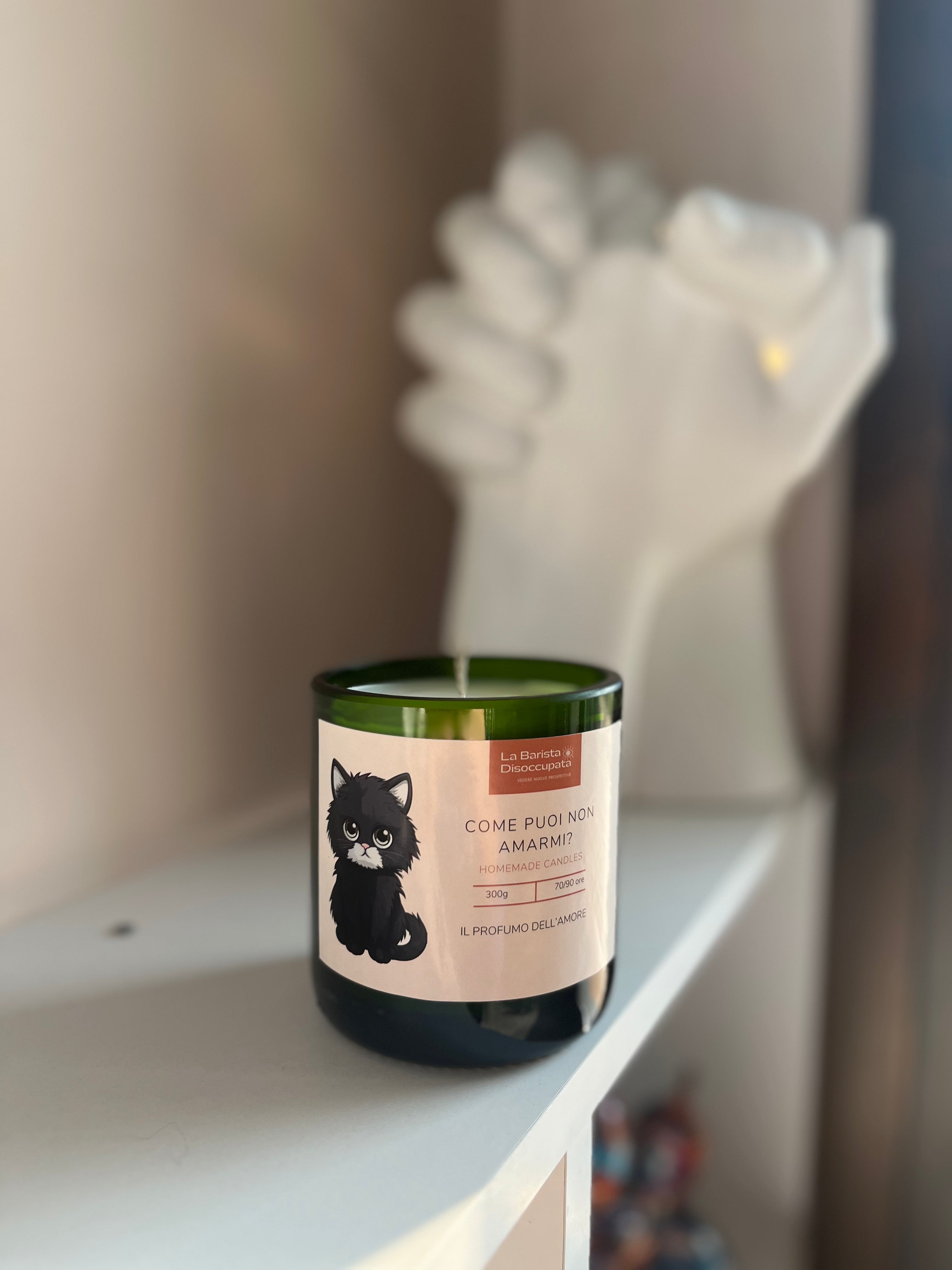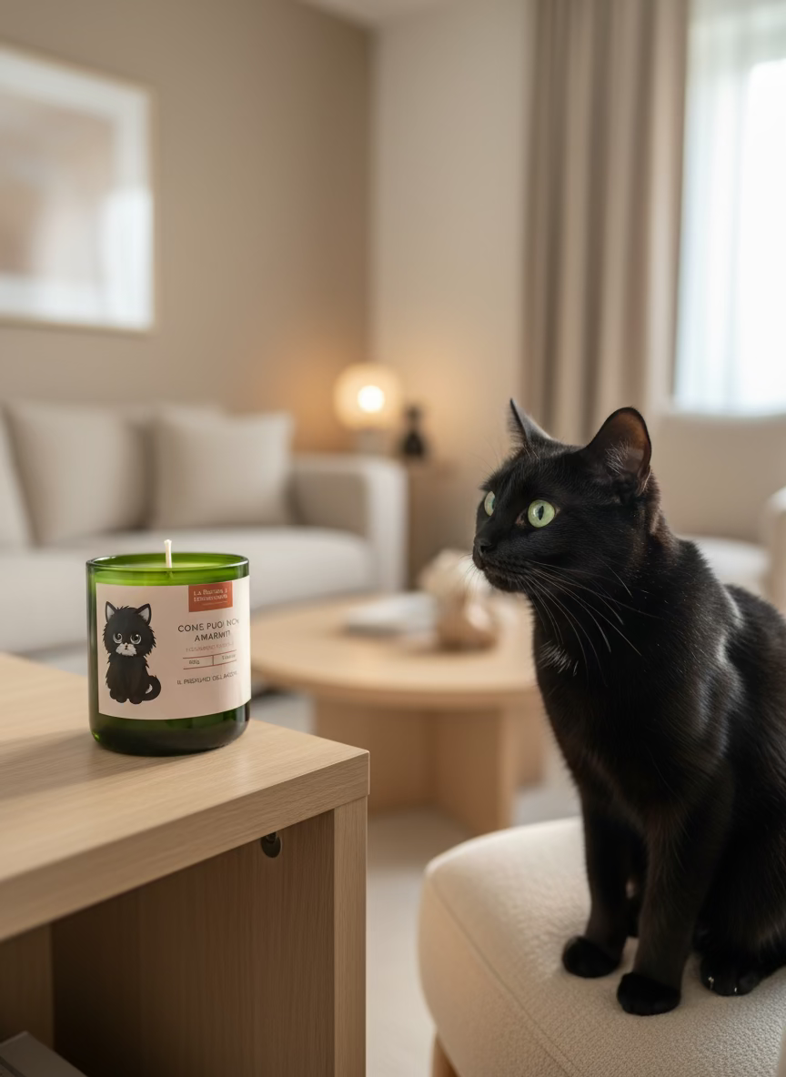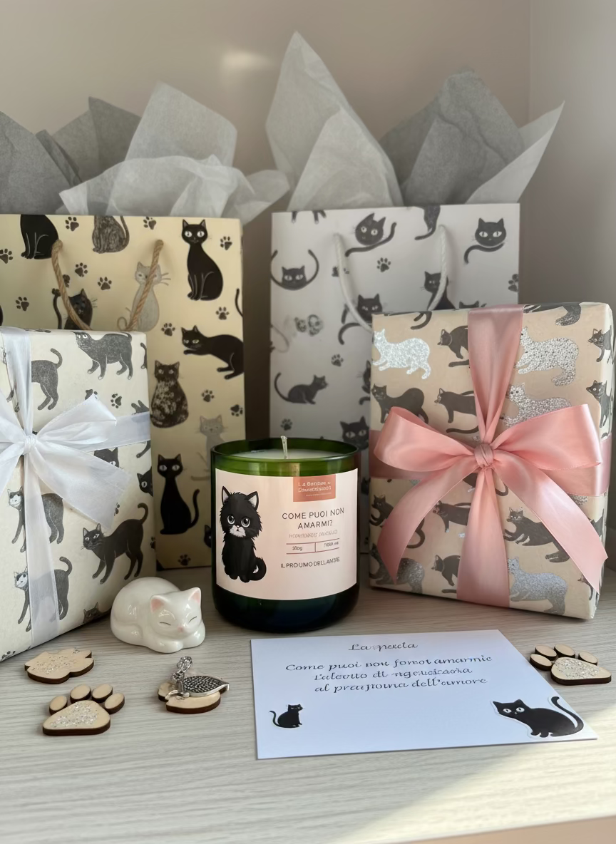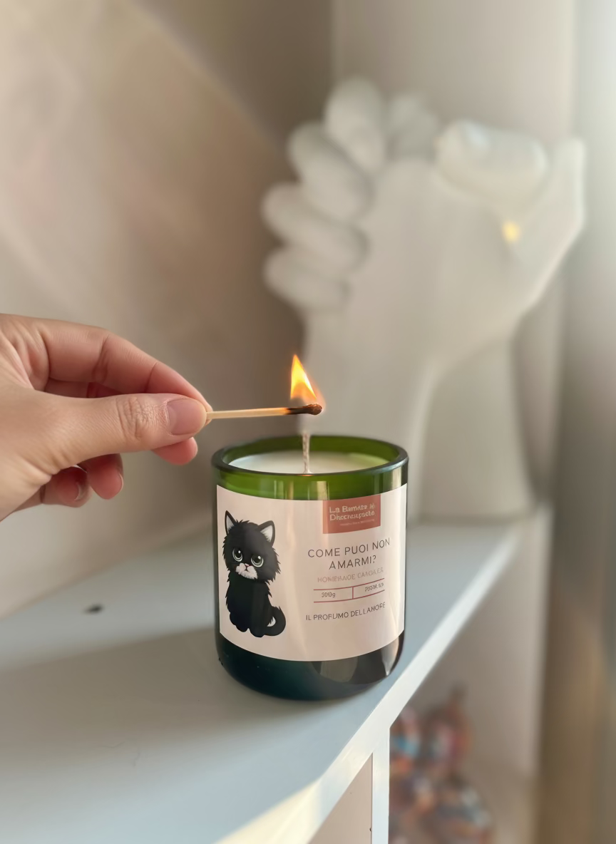Realizzata all'interno di bottiglie di vino verdi tagliate e molate, impreziosite da etichette dedicate ai nostri amici a 4 zampe, create in cera di soia, stoppino in cotone e dai profumi legati al sentimento che ispirano questi dolci cuccioli. Sono tutte pensate con la scatolina color havana per accompagnarle.