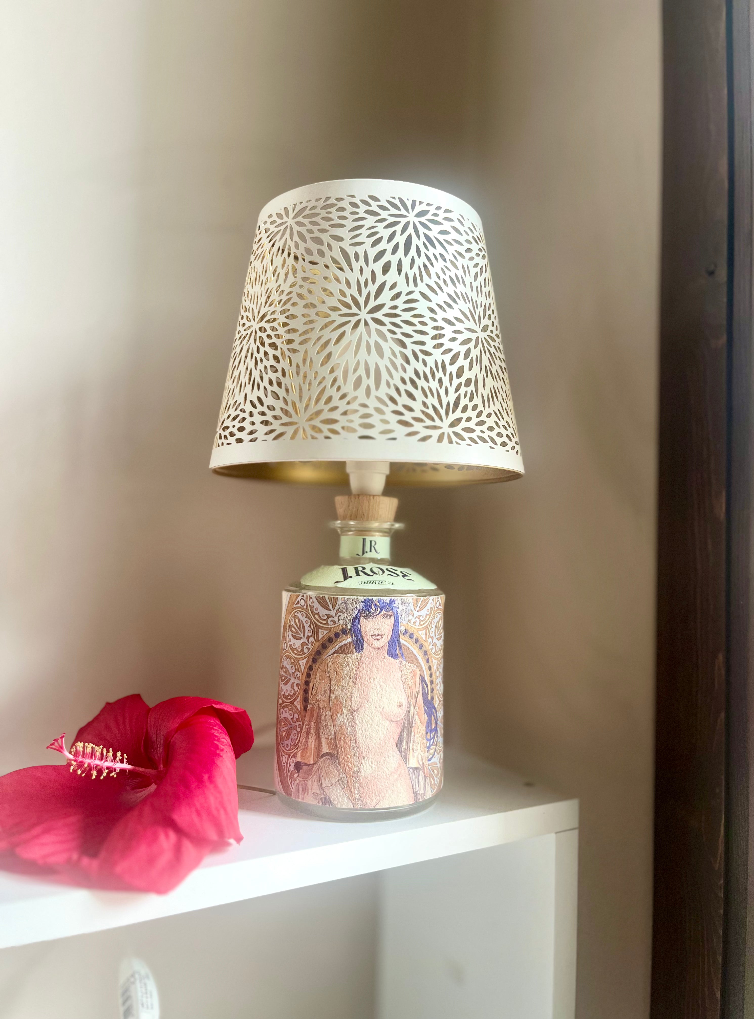 Ricavata grazie al riciclo di una bottiglia di gin J.Rose da 700 ml, portalampada bianco, paralume in acciaio bianco e oro che crea bellissime ombre. Lampadina inclusa nel prezzo.