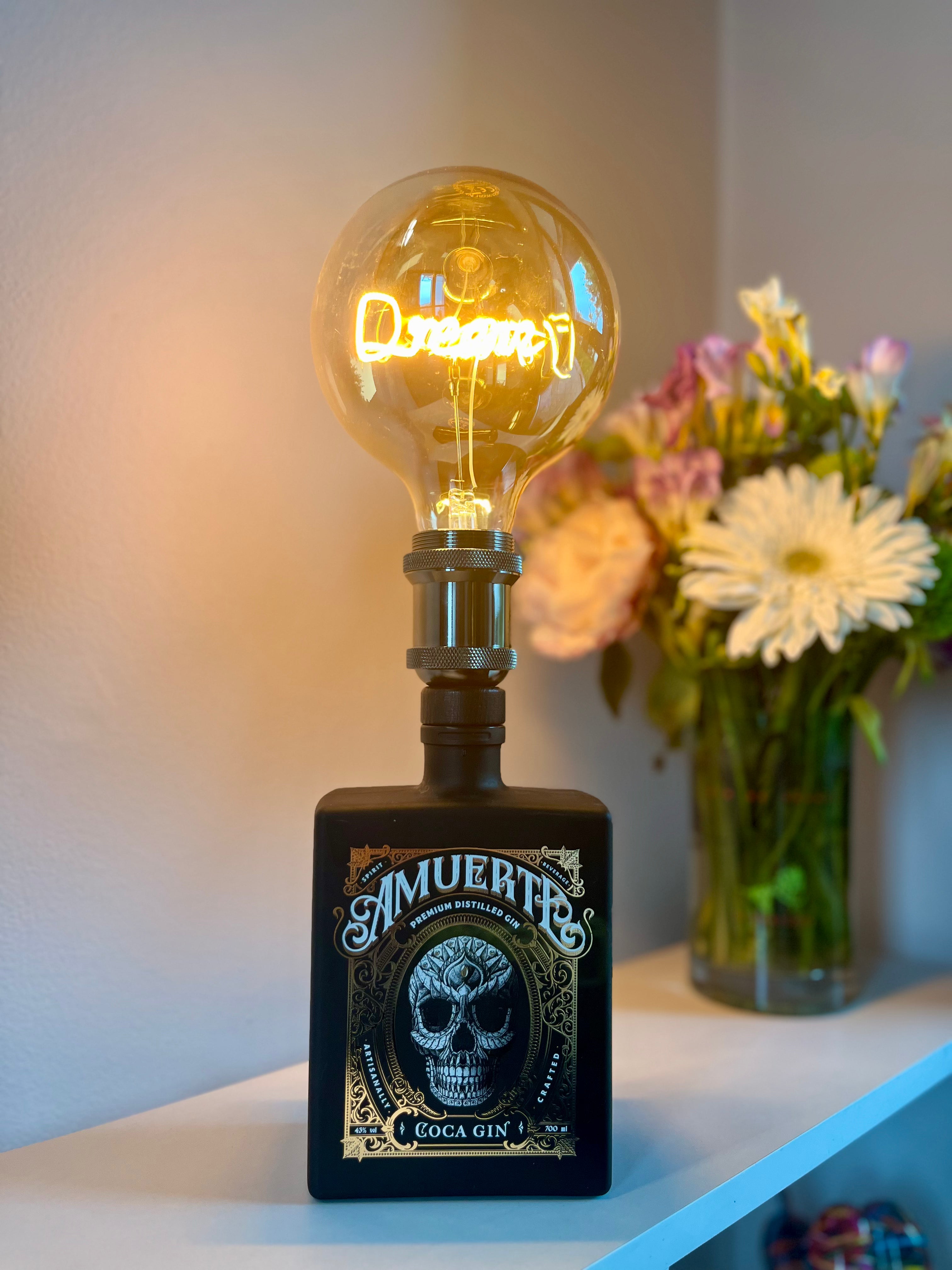 Ricavata da una bottiglia di gin Amuerte nero da 700 ml, portalampada in acciaio e ceramica.