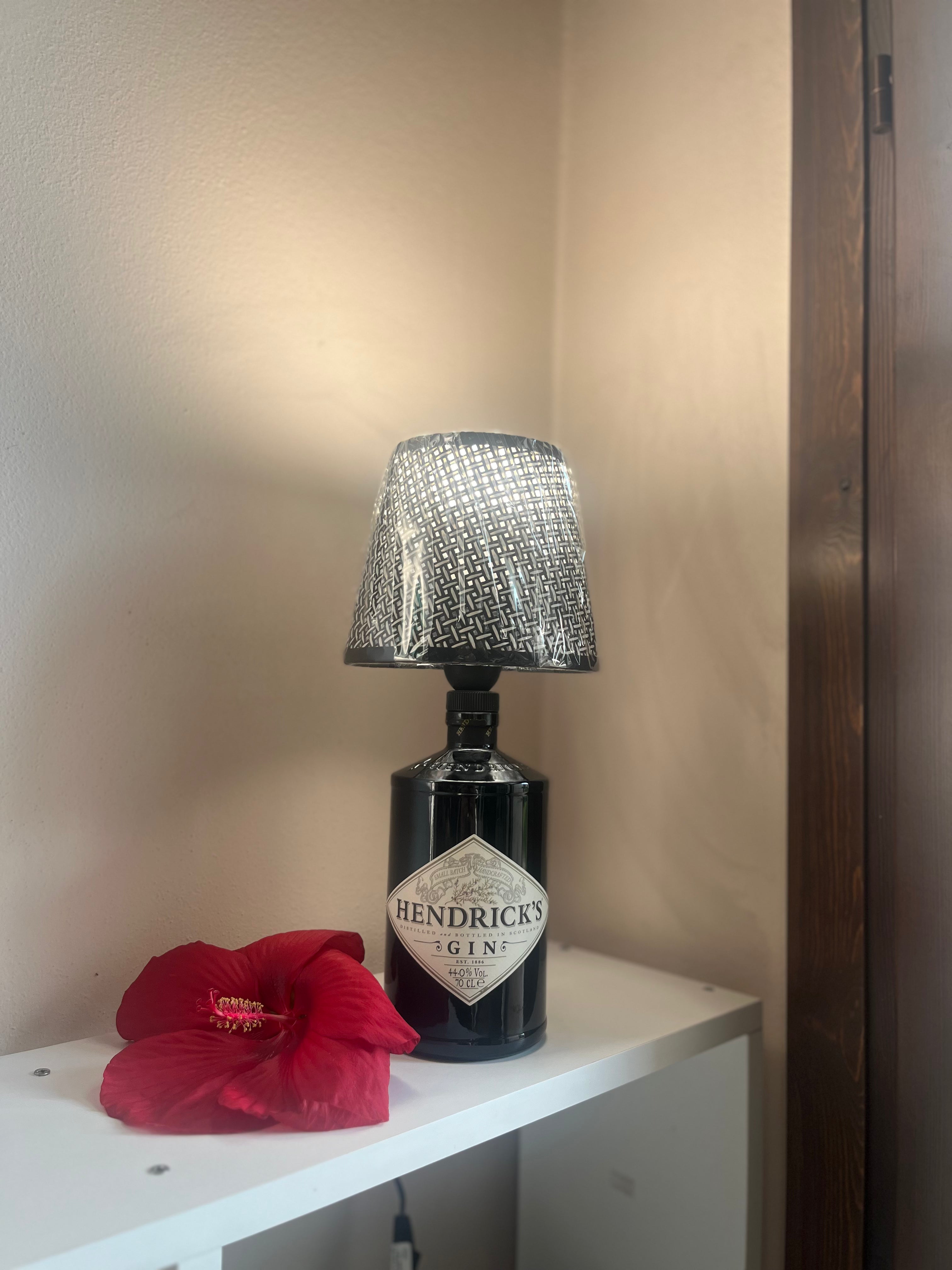Ricavata da una bottiglia di Hendrick's da 700 ml, paralume in corda e plastica e lampadina a Led inclusa.