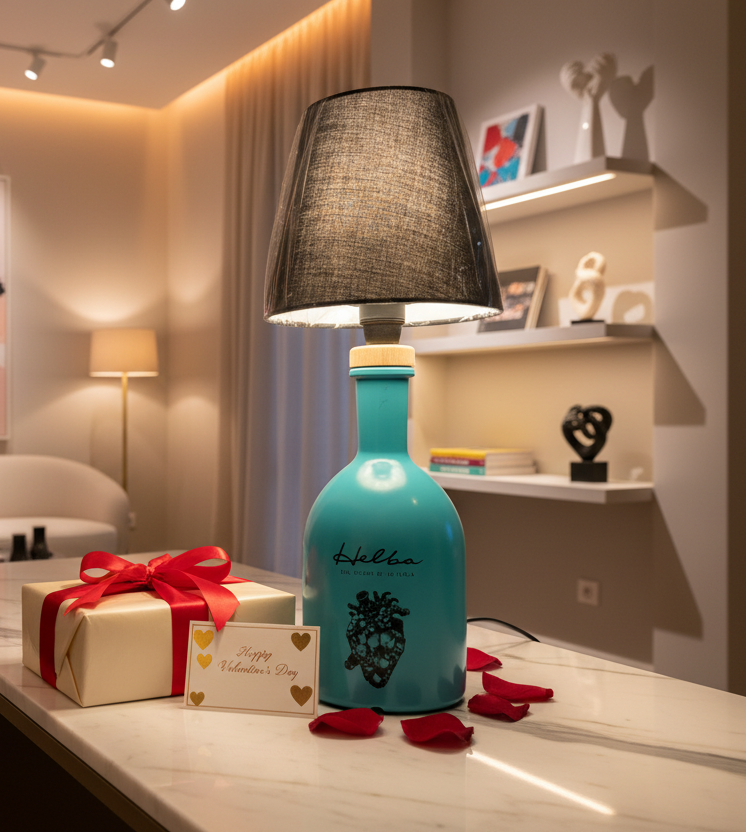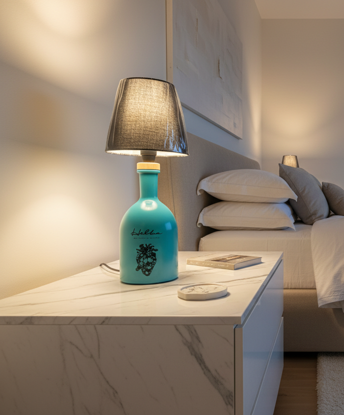 Ricavata da una bottiglia di HElba da 700 ml, paralume in tessuto nero e lampadina a Led inclusa.