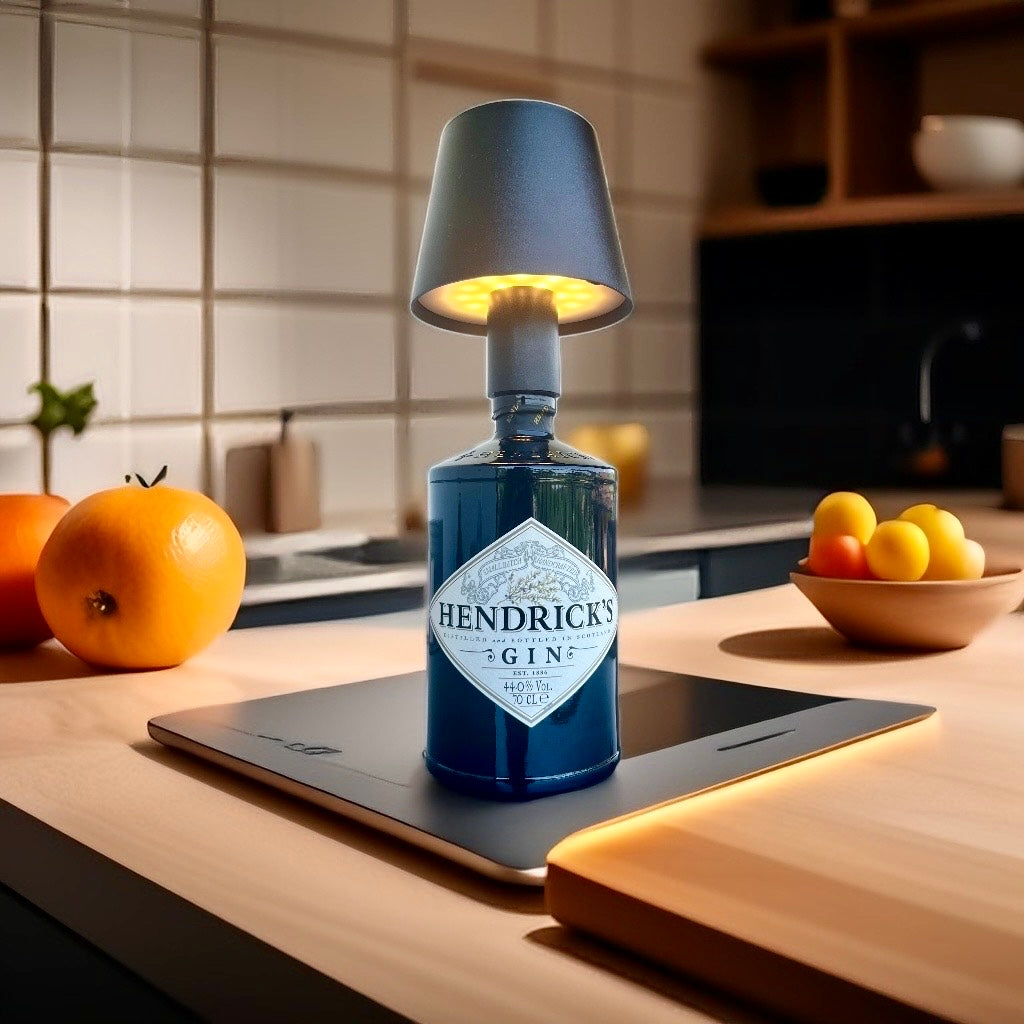 Questa lampada non ha necessità di essere collegata alla rete elettrica, il paralume color bronzo funge da lampadina dimmerabile (tre gradazioni di colore). Presenta un foro per inserire e ricaricare il paralume all’evenienza, il cavo di ricarica è incluso.