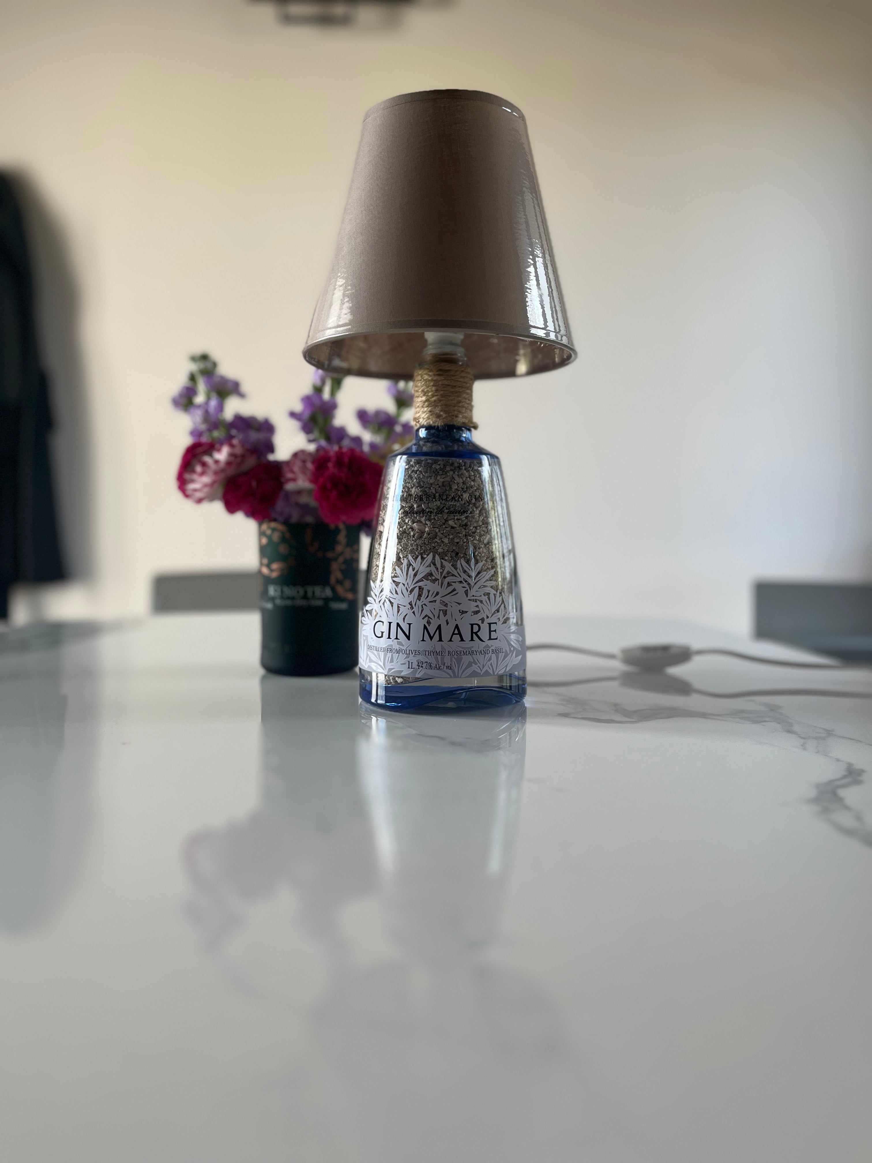 Ricavata da una bottiglia di Mare da 1 litro, paralume in tessuto bianco, sabbia all'interno e collo rivestito in filo di canapa.