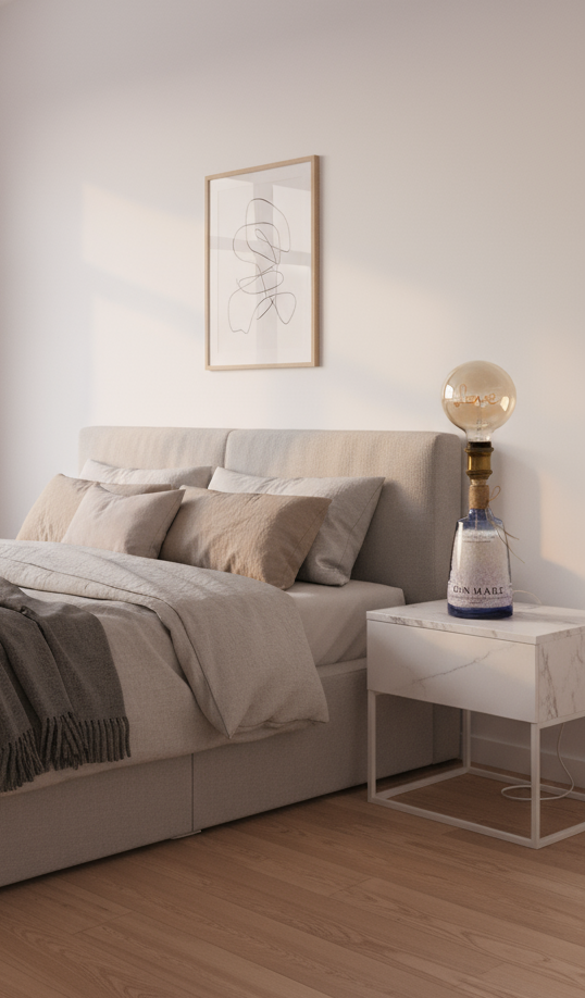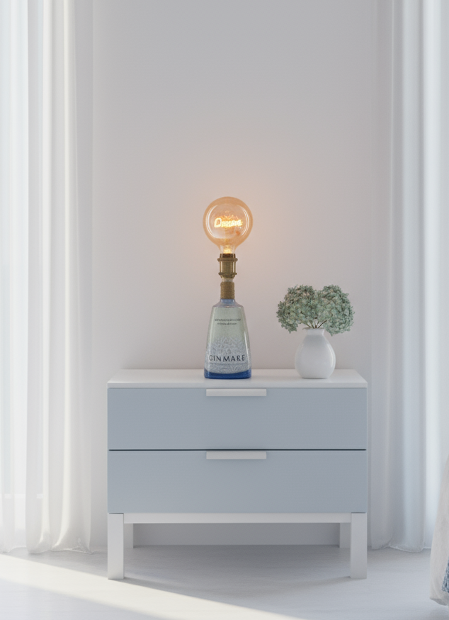 Ricavata da una bottiglia di Mare da 1litro, portalampada color bronzo e lampada sferica con scritta o luci a led.Realizzata a mano. Le piccole imperfezioni donano alla stessa l'unicità che merita ognuno di questi pezzi di riciclo.