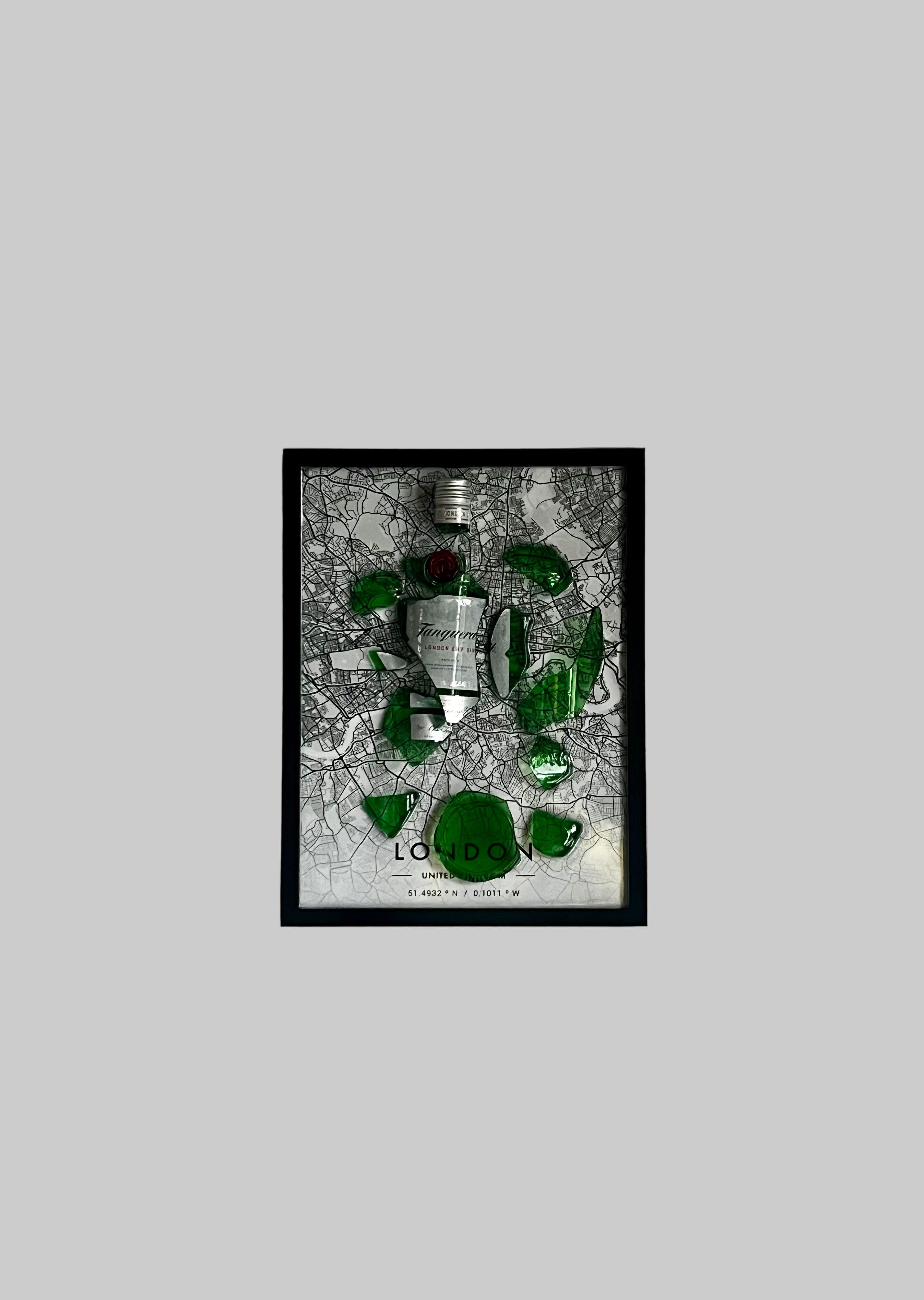 La collezione “Appendi il Drink” è formata da pezzi unici come ”London Dry Gin”, creato con una bottiglia di Campari bitter, stampa con fondo cartina di Milano e cornice in legno.