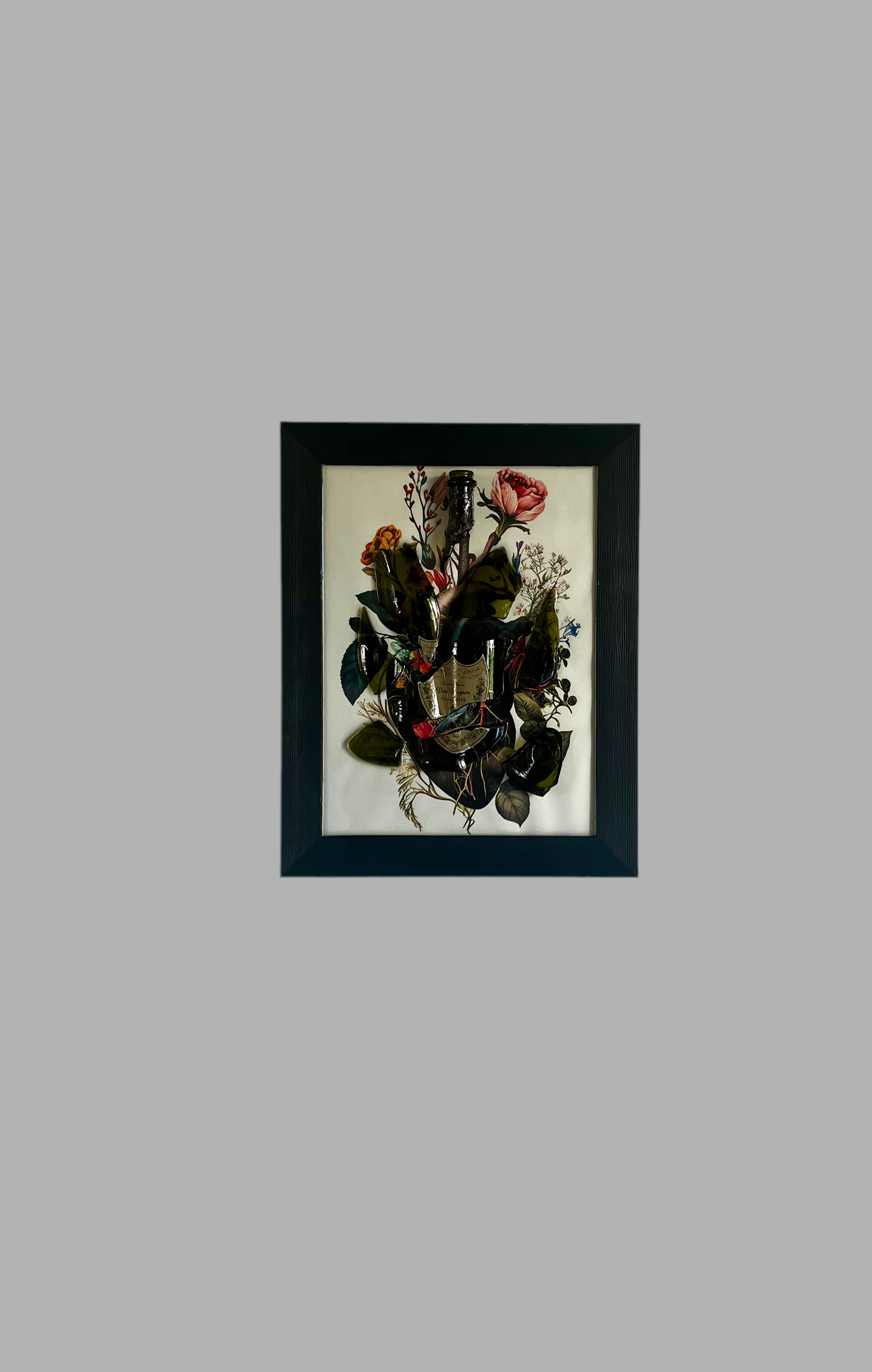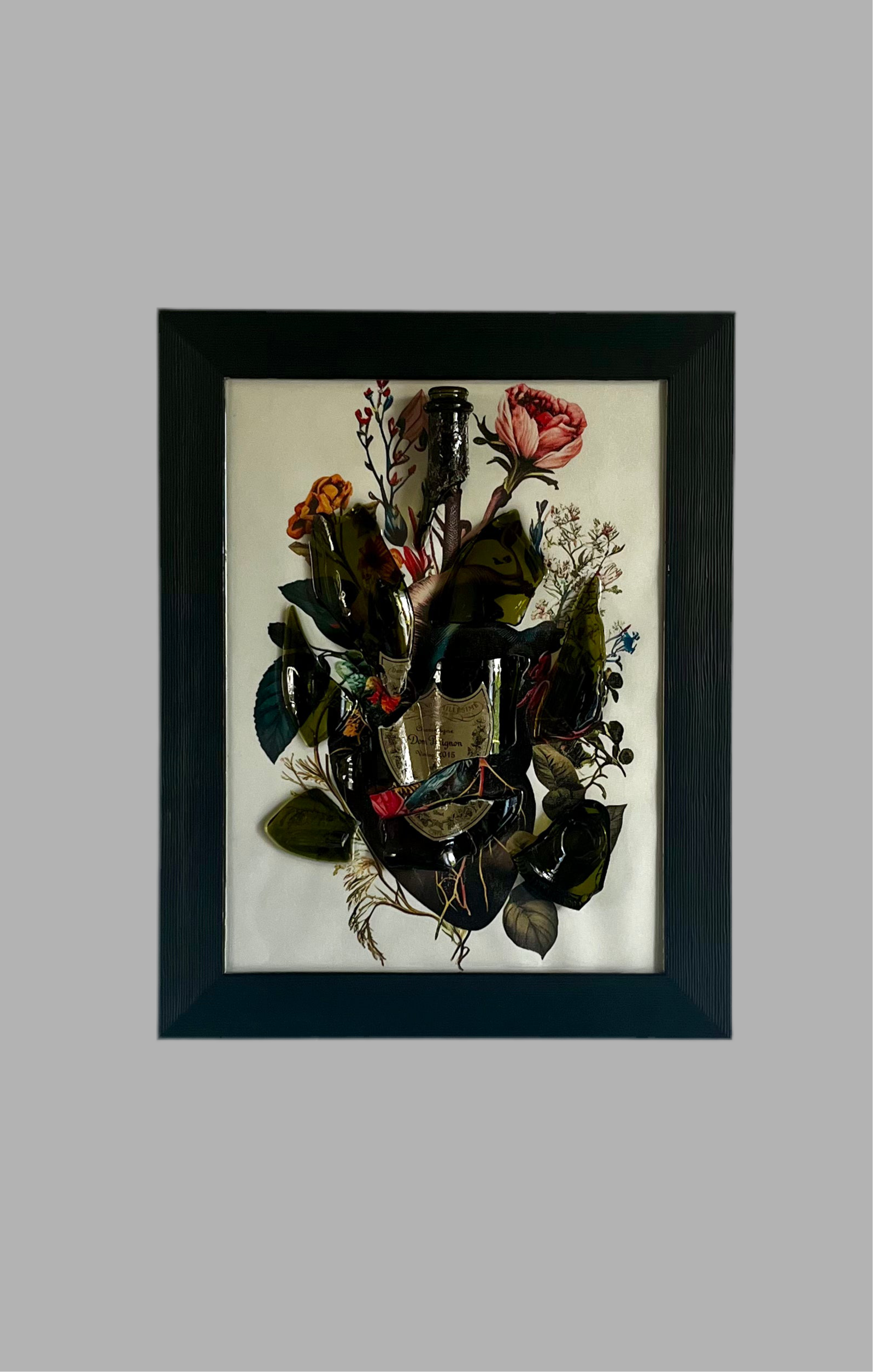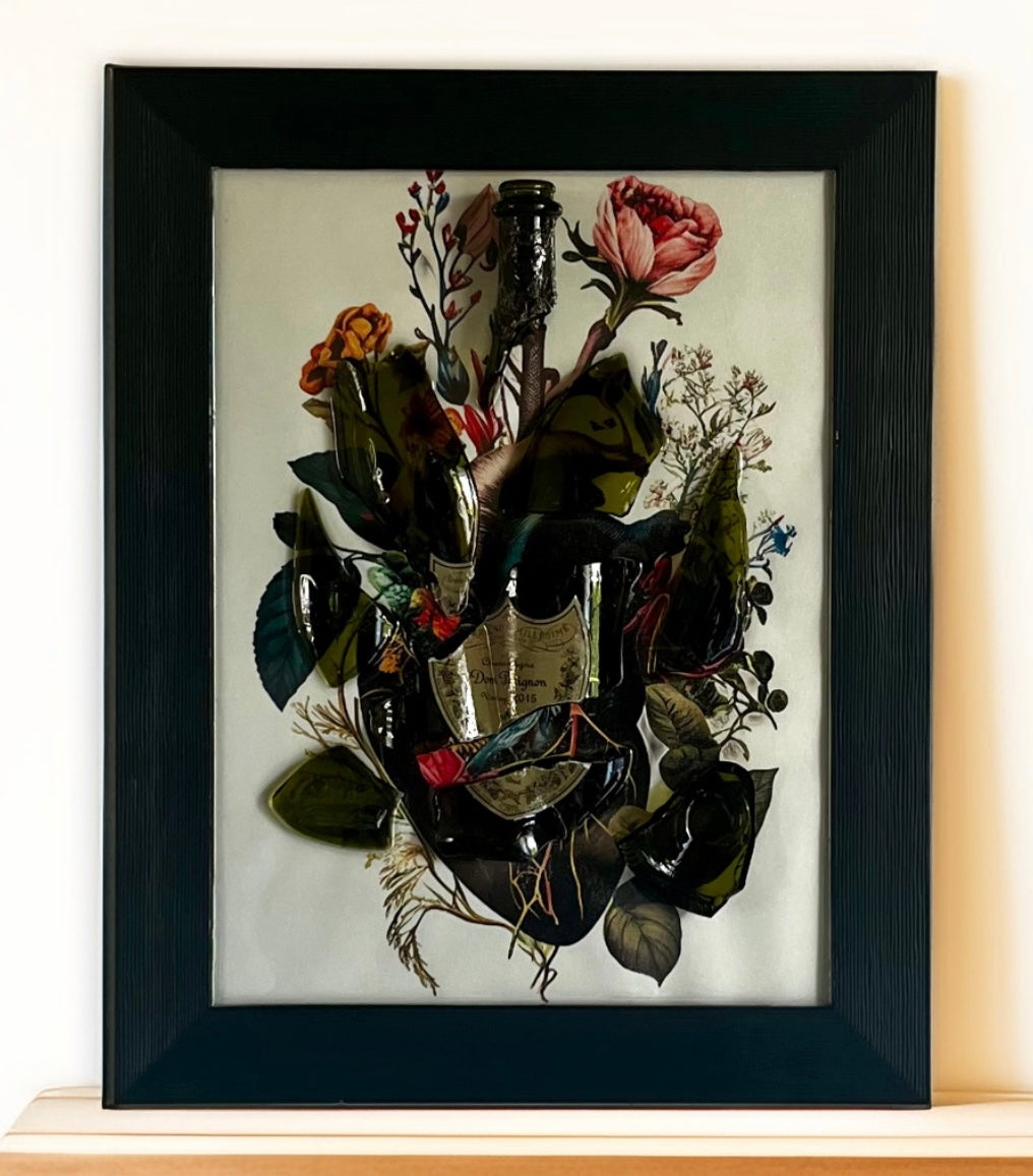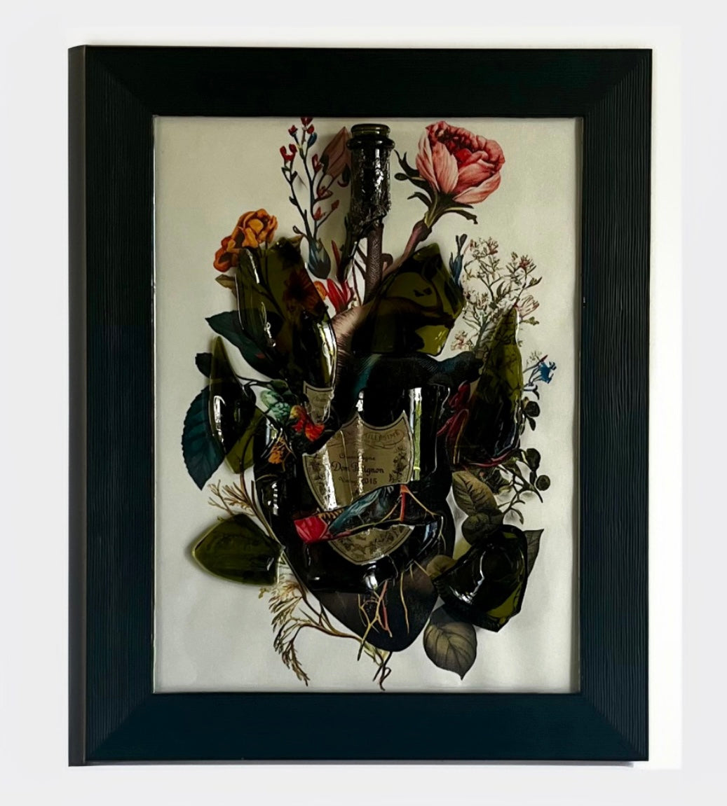 La collezione “Appendi il Drink” è formata da pezzi unici come “Flowery Heart”, creato con una bottiglia di Dom Perignon, rotta e ricomposta e stampa con sfondo cuore con fiori.