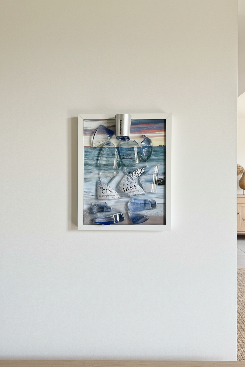Il fascino del mare, racchiuso in un’opera unica. Questo quadro nasce dal recupero di una bottiglia originale Gin Mare, lavorata a mano e trasformata in una composizione artistica che richiama le atmosfere del Mediterraneo. I frammenti di vetro si fondono con uno sfondo marino, creando giochi di luce e riflessi che donano profondità e carattere all’ambiente.