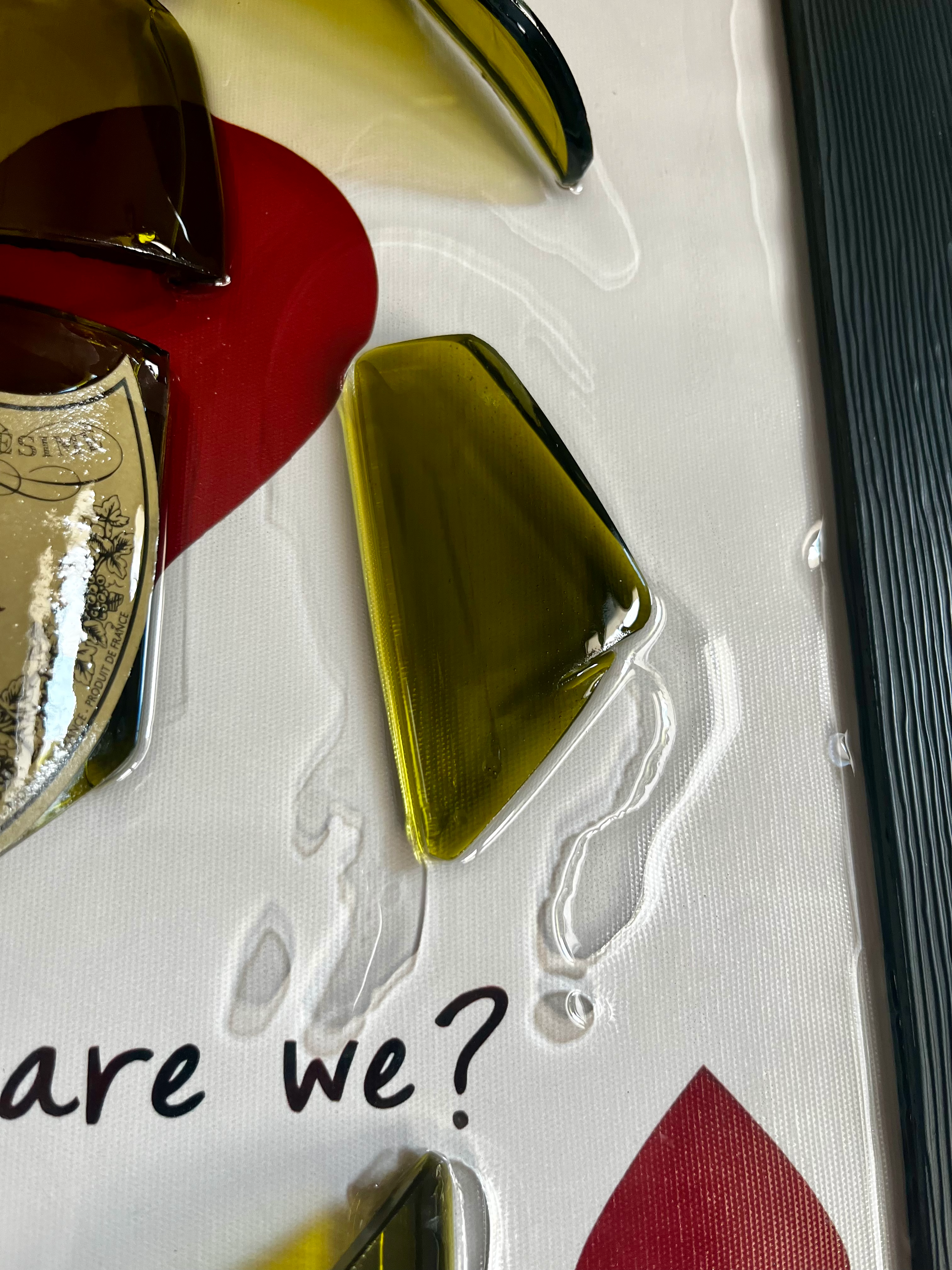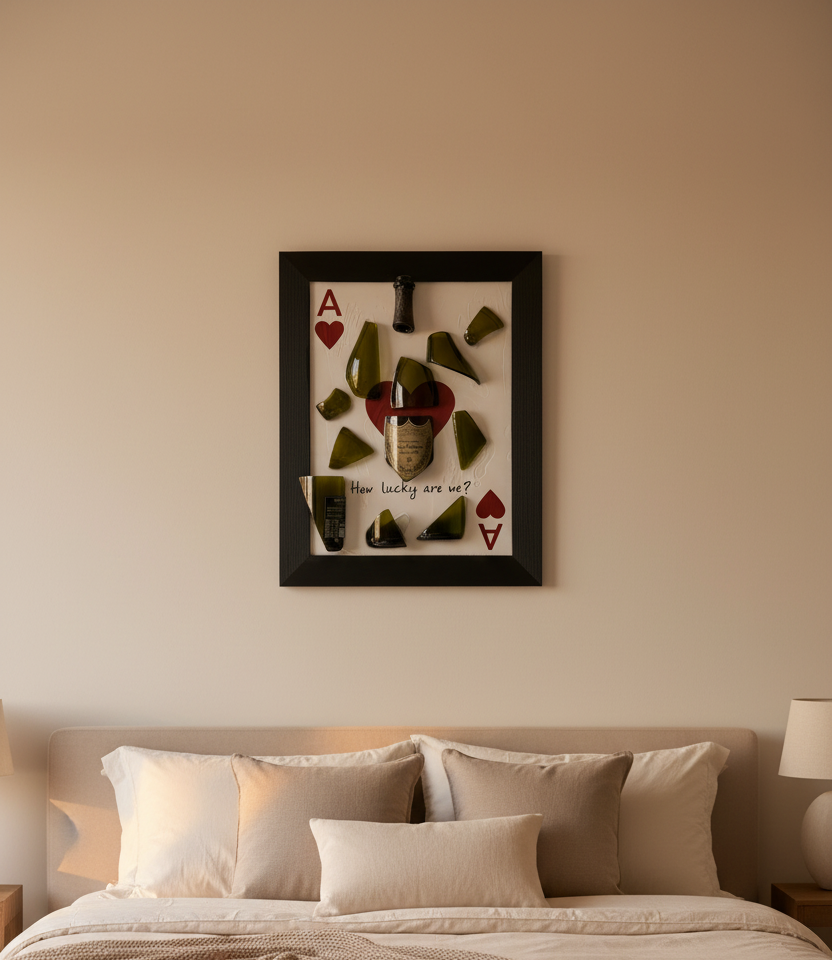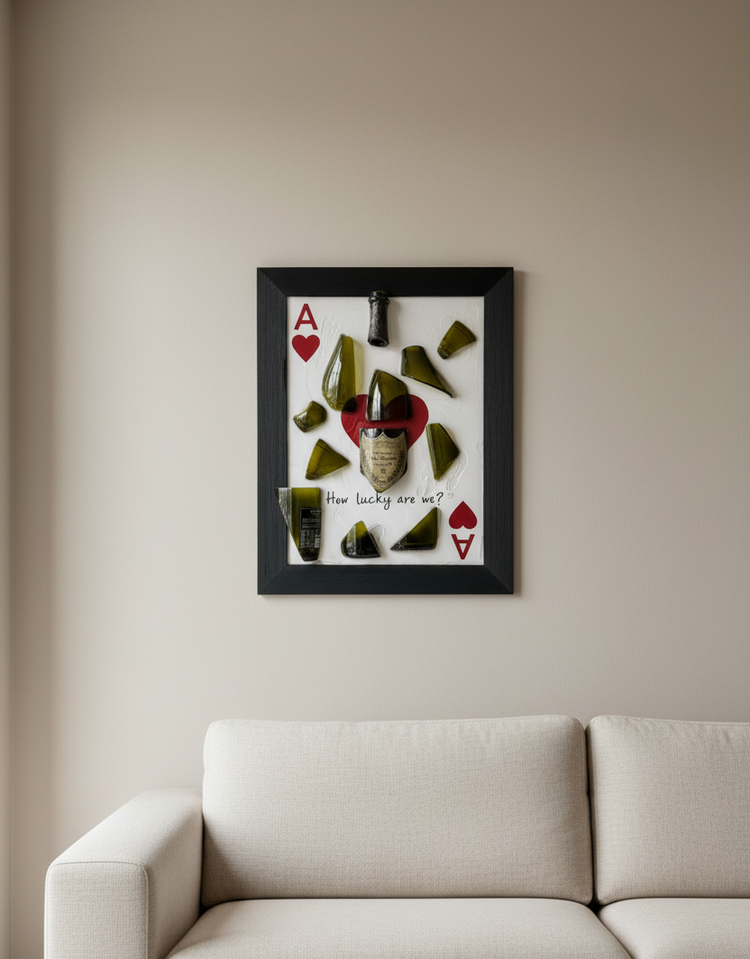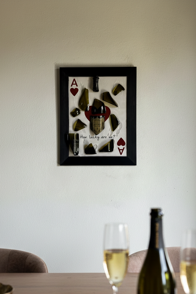 Questo quadro nasce dal recupero di una vera bottiglia di champagne, lavorata a mano e ricomposta in una composizione unica. I frammenti di vetro si uniscono a un design iconico ispirato alle carte da gioco, con il cuore al centro e la frase “How lucky are we?” che racconta molto più di un semplice oggetto decorativo.