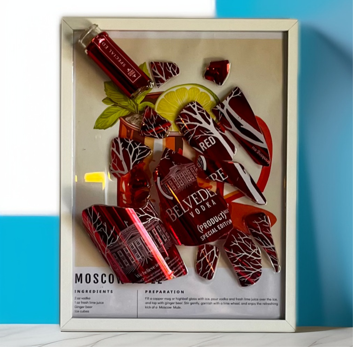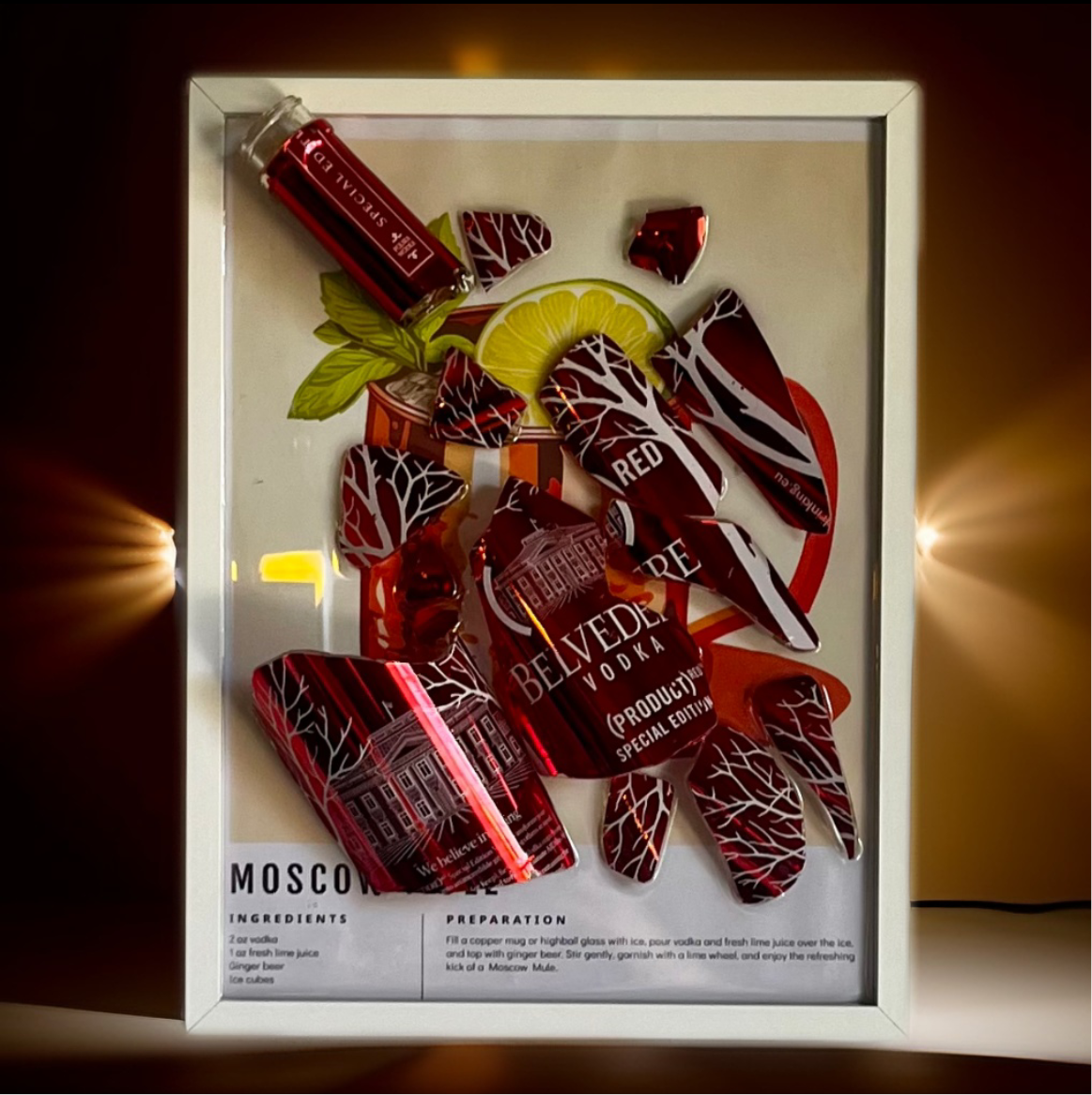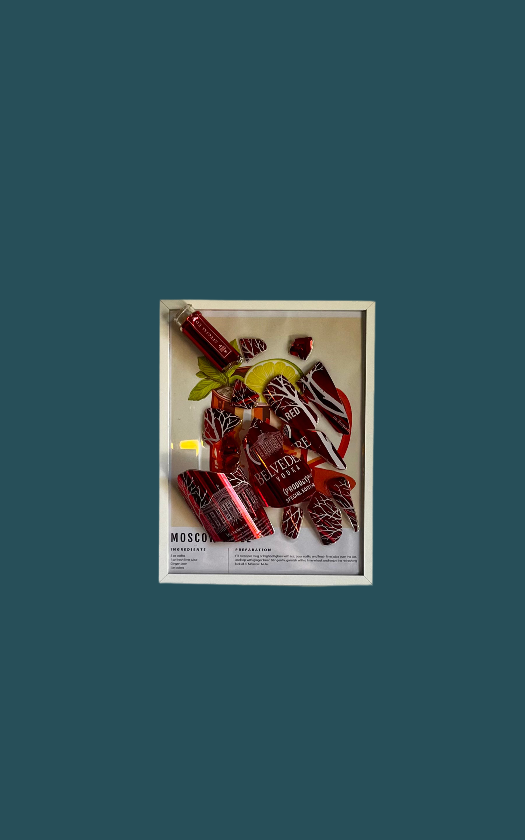 La collezione “Appendi il Drink” è formata da pezzi unici come “Red Moscow Mule”, stampa con ricetta moscow mule, cornice bianca e bottiglia limiterà edition rossa Belvedere, spezzata e levigata.