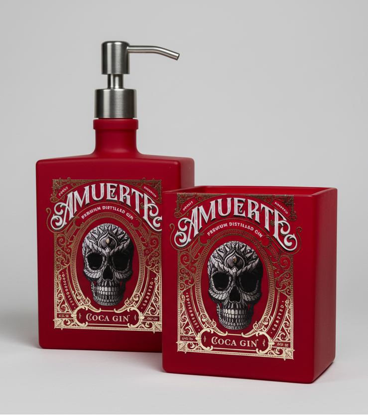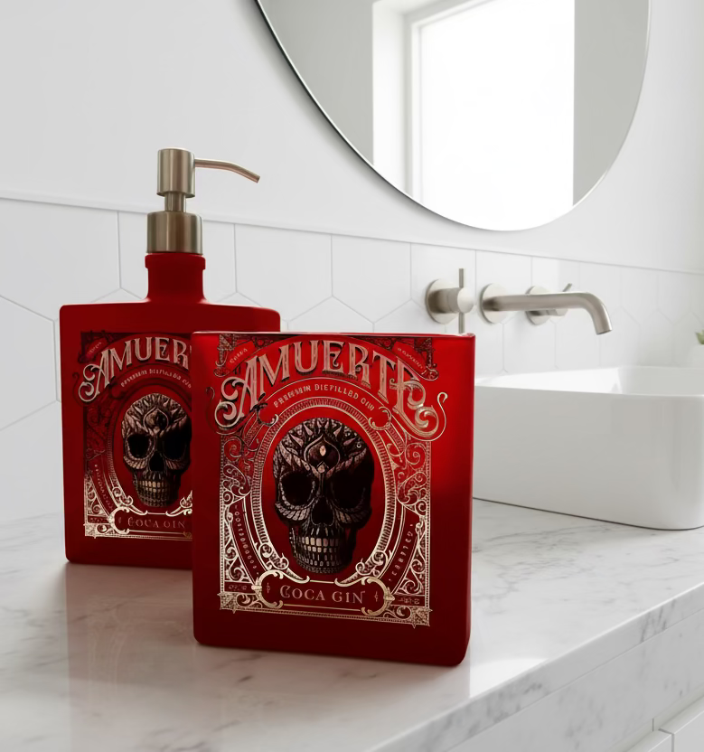 Completa il tuo bagno con questo raffinato set bagno artigianale composto da dispenser sapone e portaspazzolini, realizzati da un'autentica bottiglia di Gin Amuerte Rosso da 700ml.