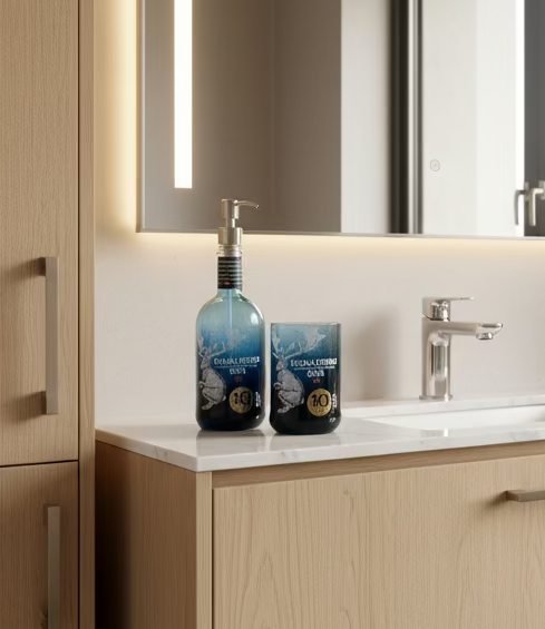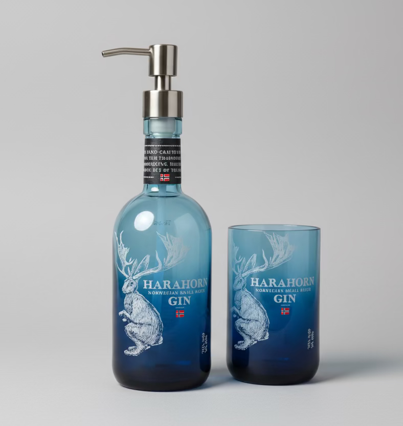 Completa il tuo bagno con questo elegante set bagno artigianale composto da dispenser sapone e portaspazzolini, realizzati da autentiche bottiglie di Harahorn Gin blu.