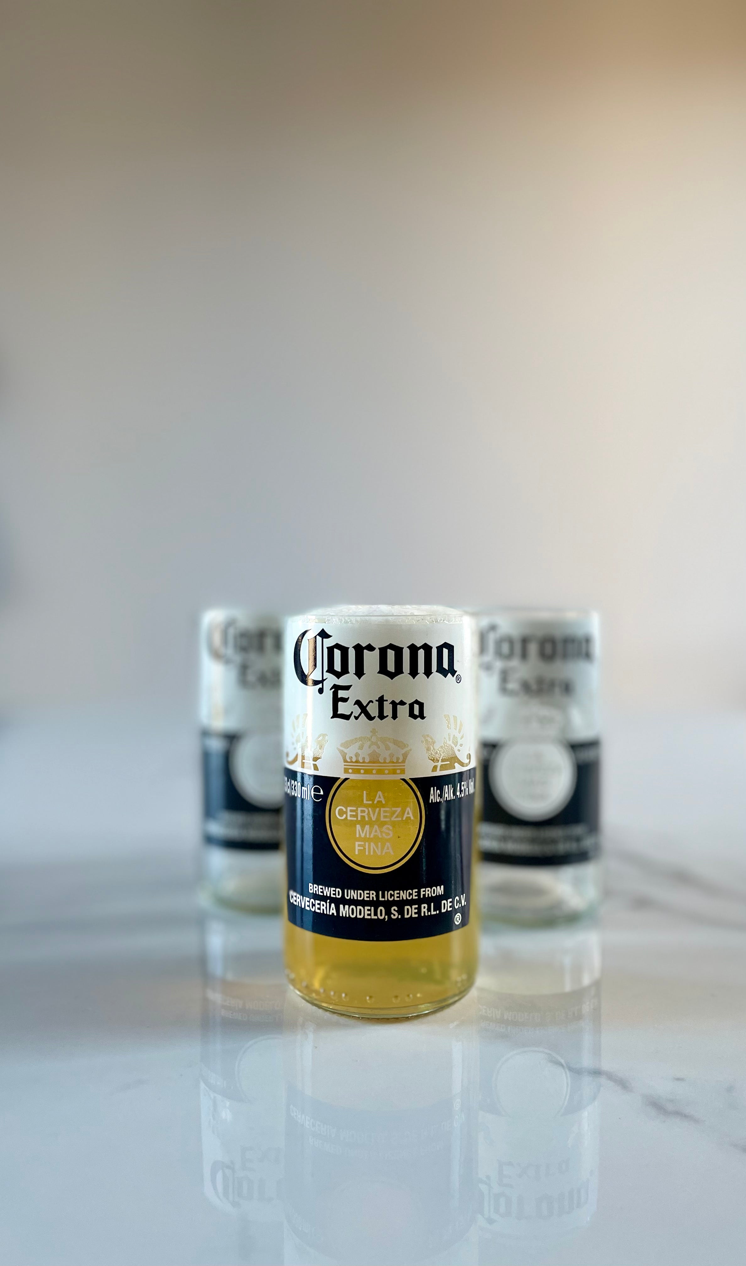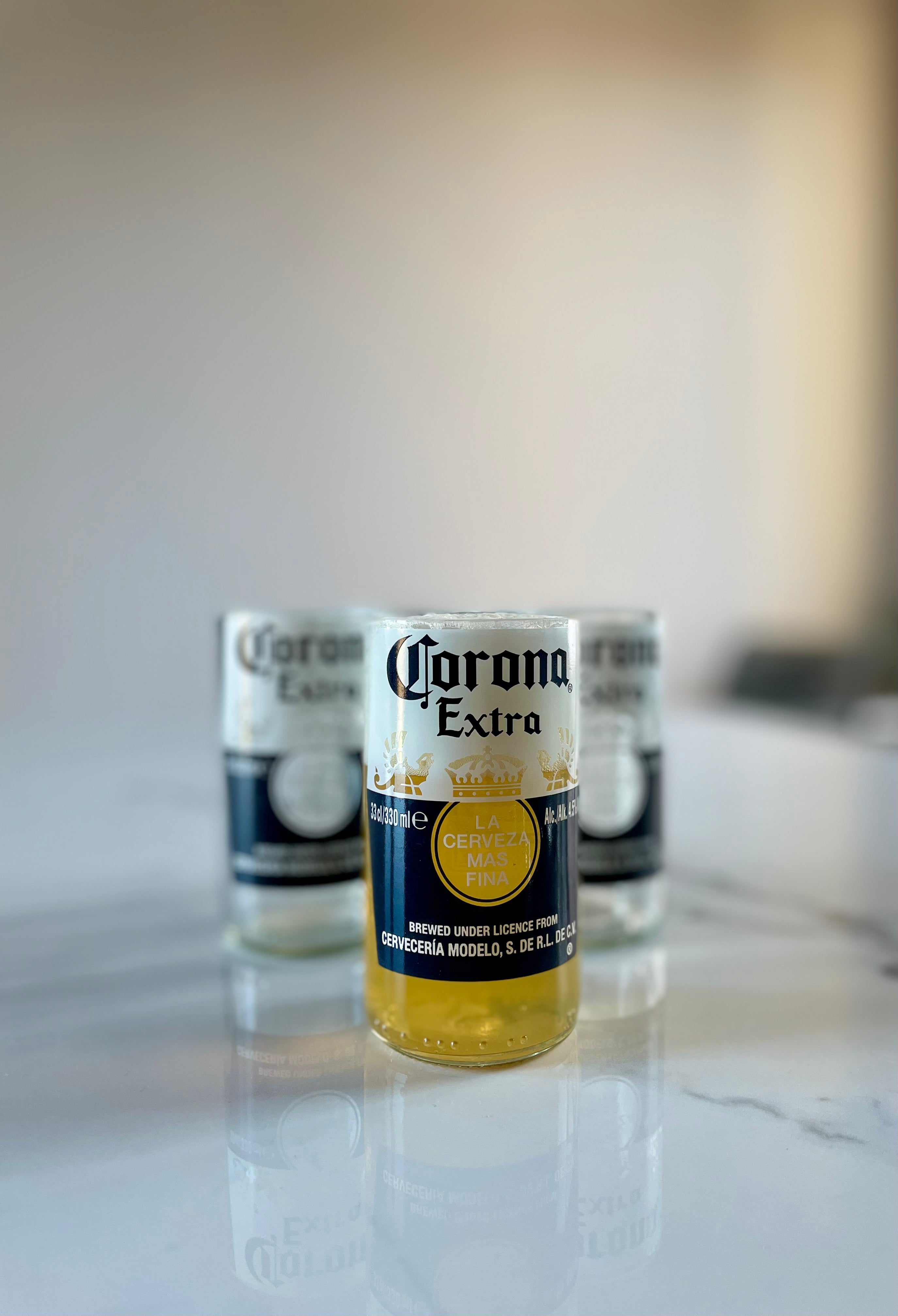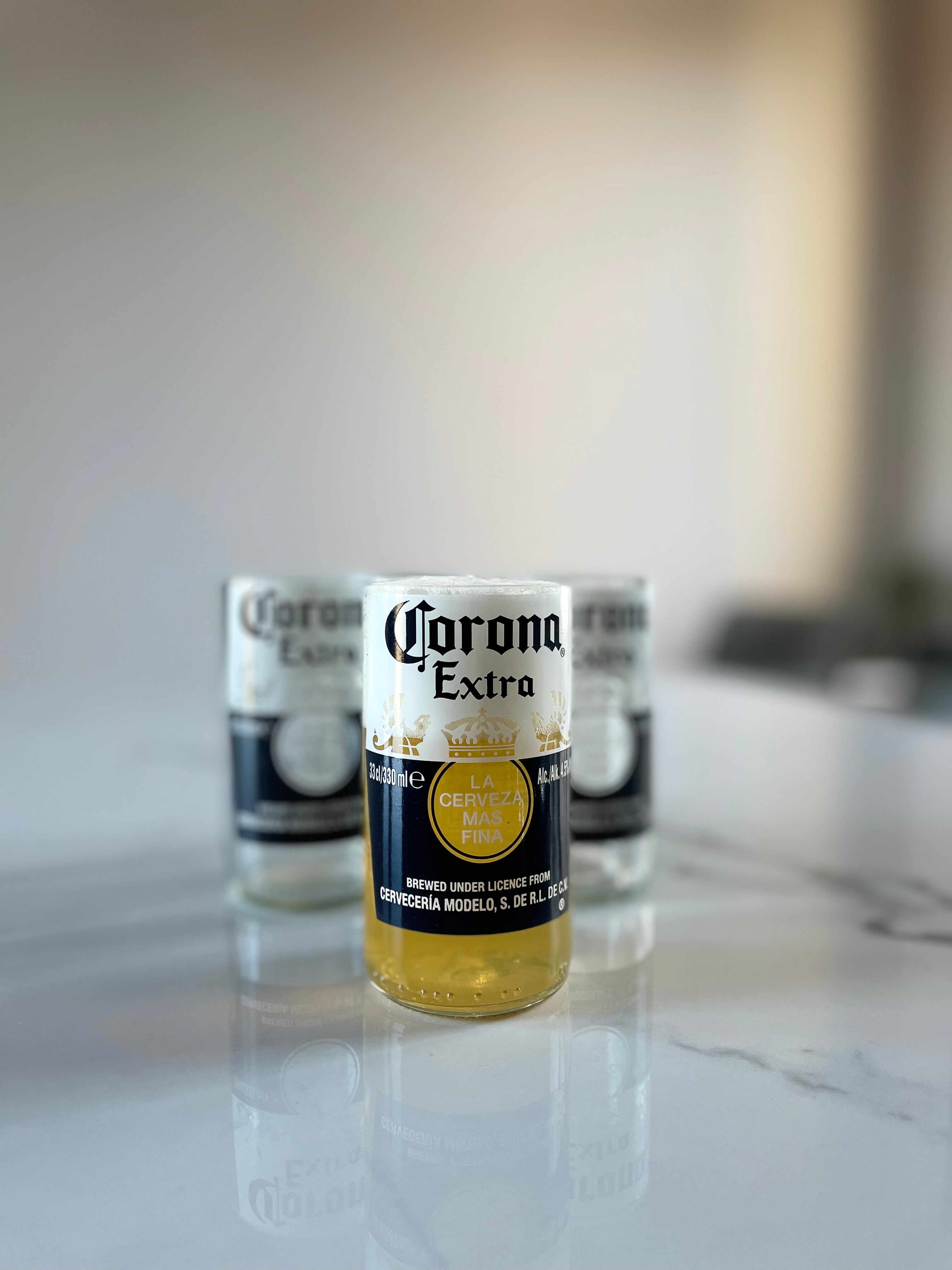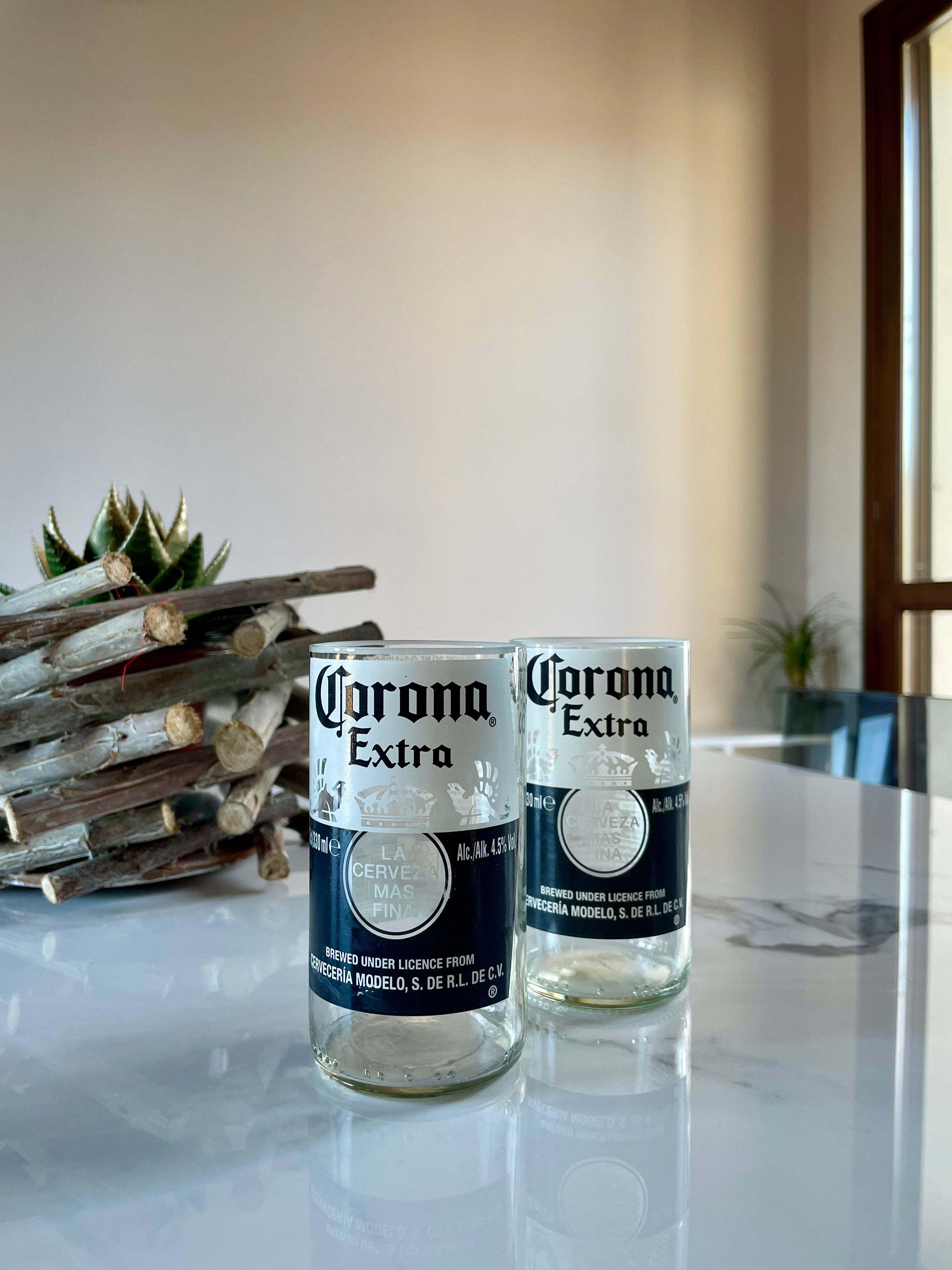 Questi bicchieri esclusivi nascono da bottiglie di birra Corona in vetro trasparente, trasformate in bicchieri dal design riconoscibile. Perfetti per chi ama la birra e il design sostenibile.