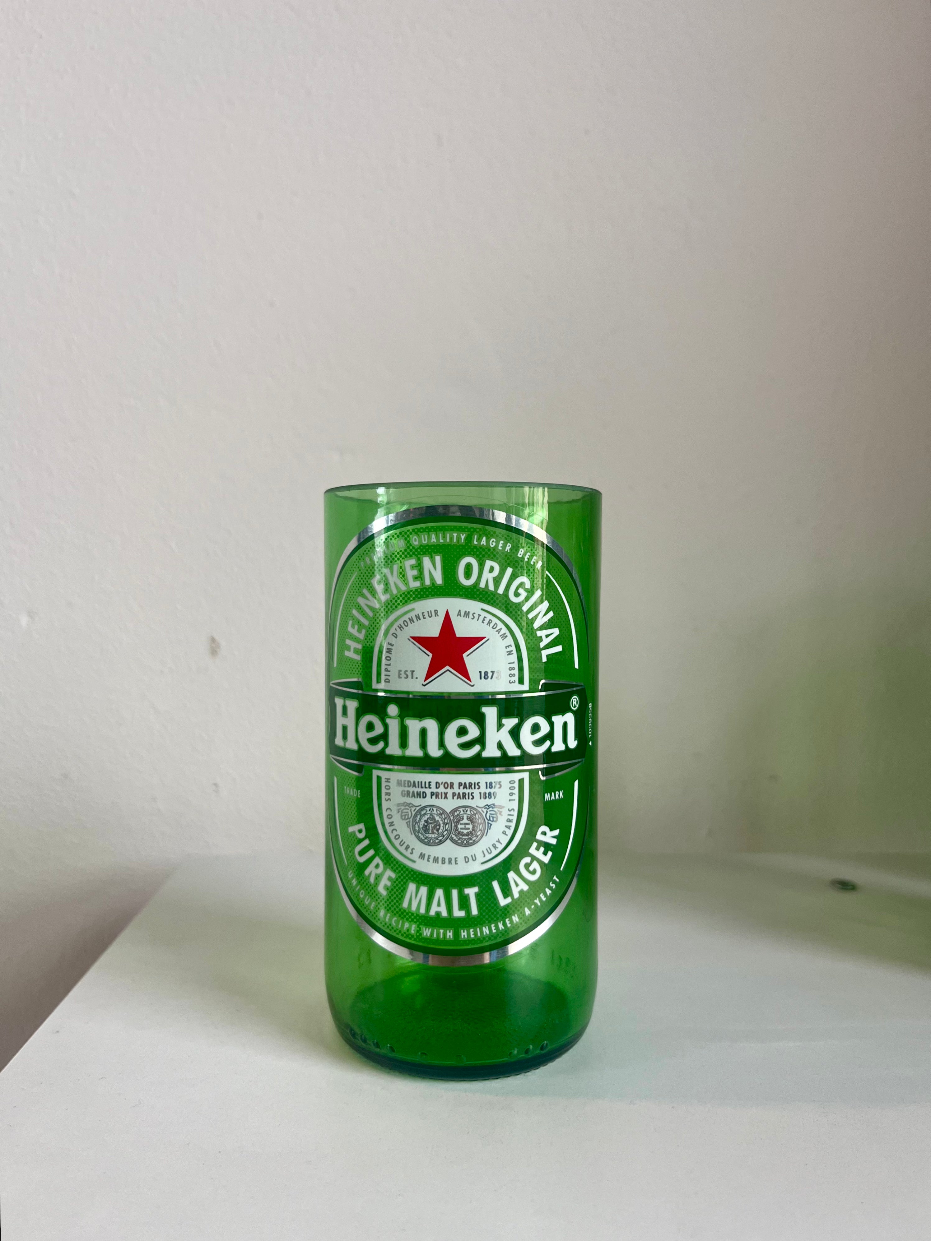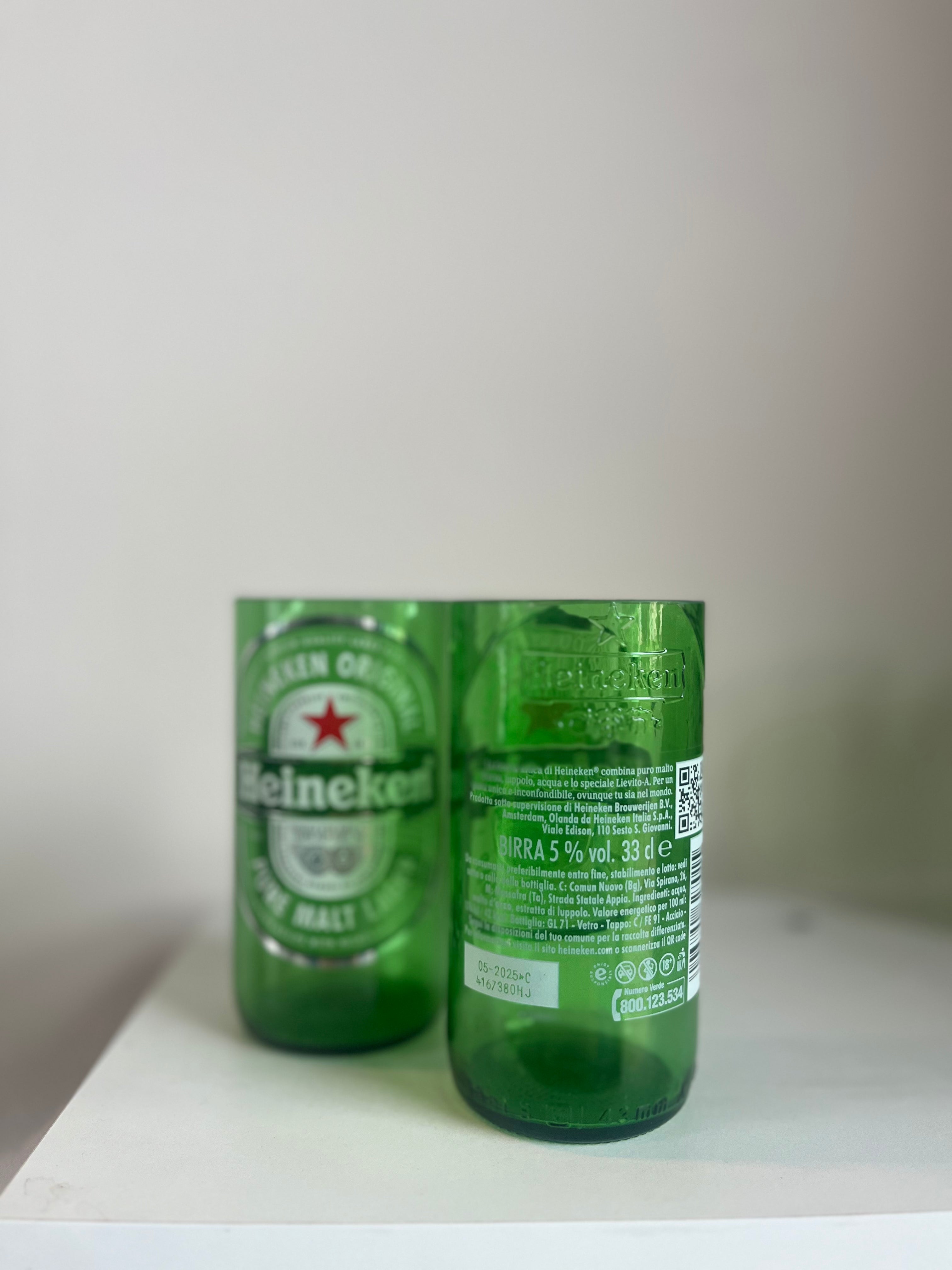 Questi bicchieri esclusivi nascono da bottiglie di birra Heineken in vetro verde, trasformate in bicchieri dal design riconoscibile. L'etichetta in plastica e la scritta in rilievo sul vetro rendono ogni pezzo unico e autentico.