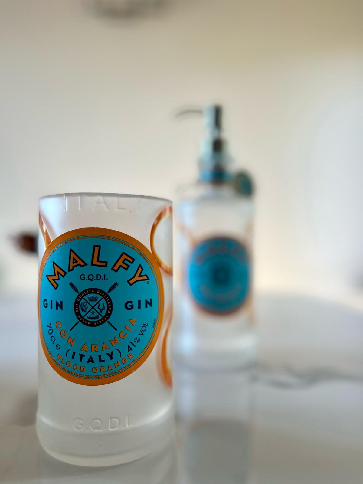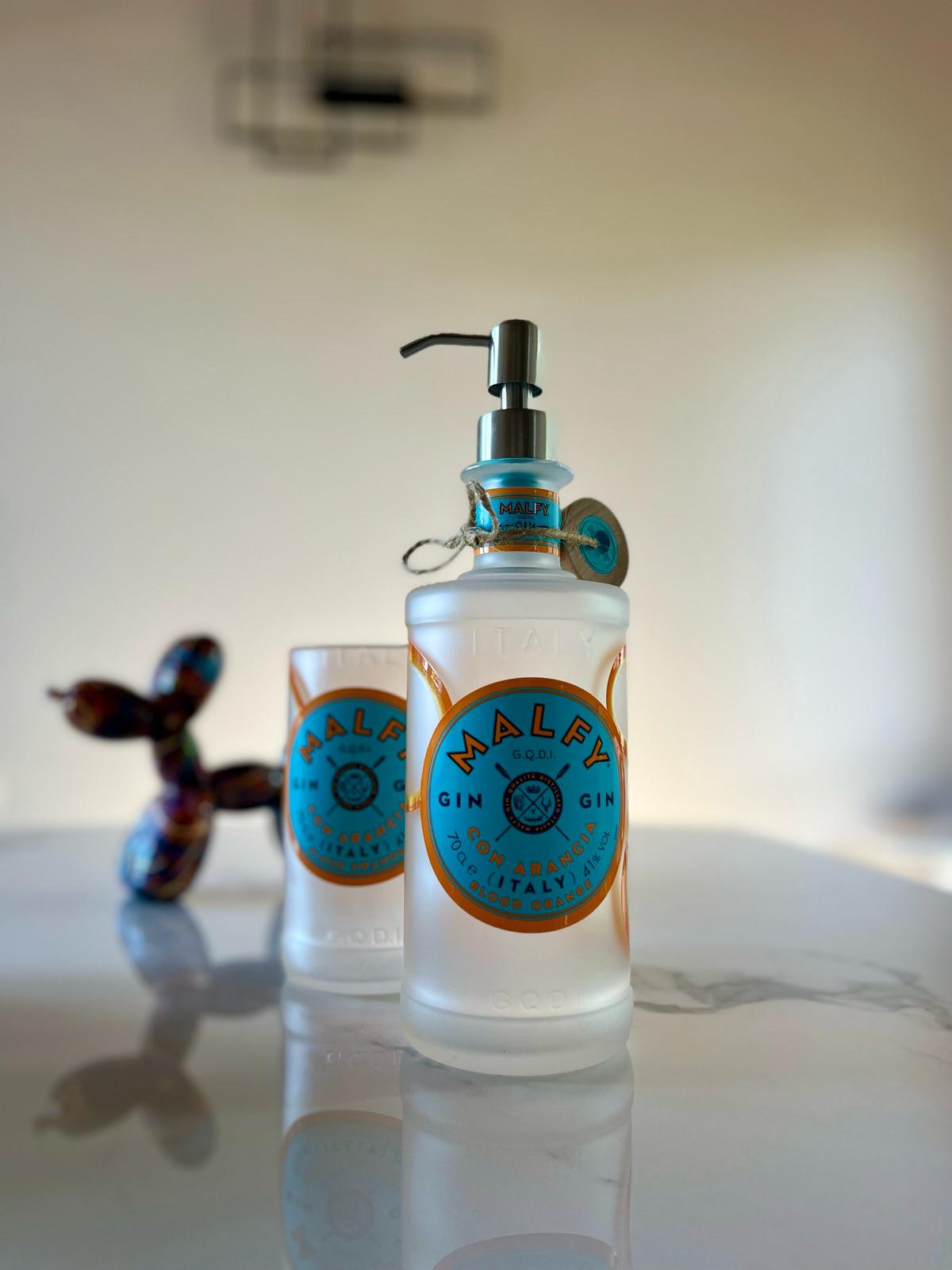 Dispenser per sapone liquido e porta spazzolini ricavati da due bottiglie di gin malfy arancione. La pompetta è in acciaio antiruggine.