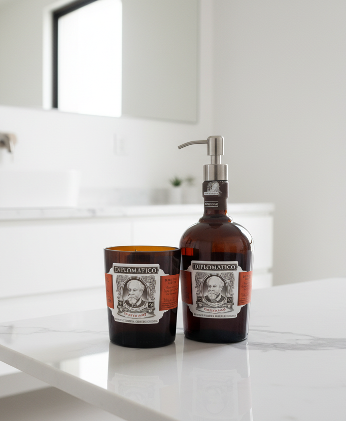 Completa il tuo bagno con questo raffinato set bagno artigianale composto da dispenser sapone e portaspazzolini, realizzati da autentiche bottiglie di Diplomatico Rum da 700ml.